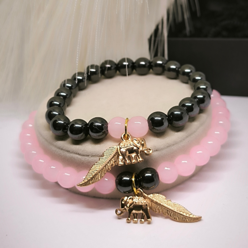 Pagamintos iš stiklo ir hematito karoliukų, šios apyrankės pasižymi ne tik estetiškumu, bet ir ypatinga energija. Aukso spalvos detalės papuošalams suteikia elegancijos ir prabangos, o jų simbolinė prasmė puikiai tinka kaip meilės ir stipraus ryšio simbolis.