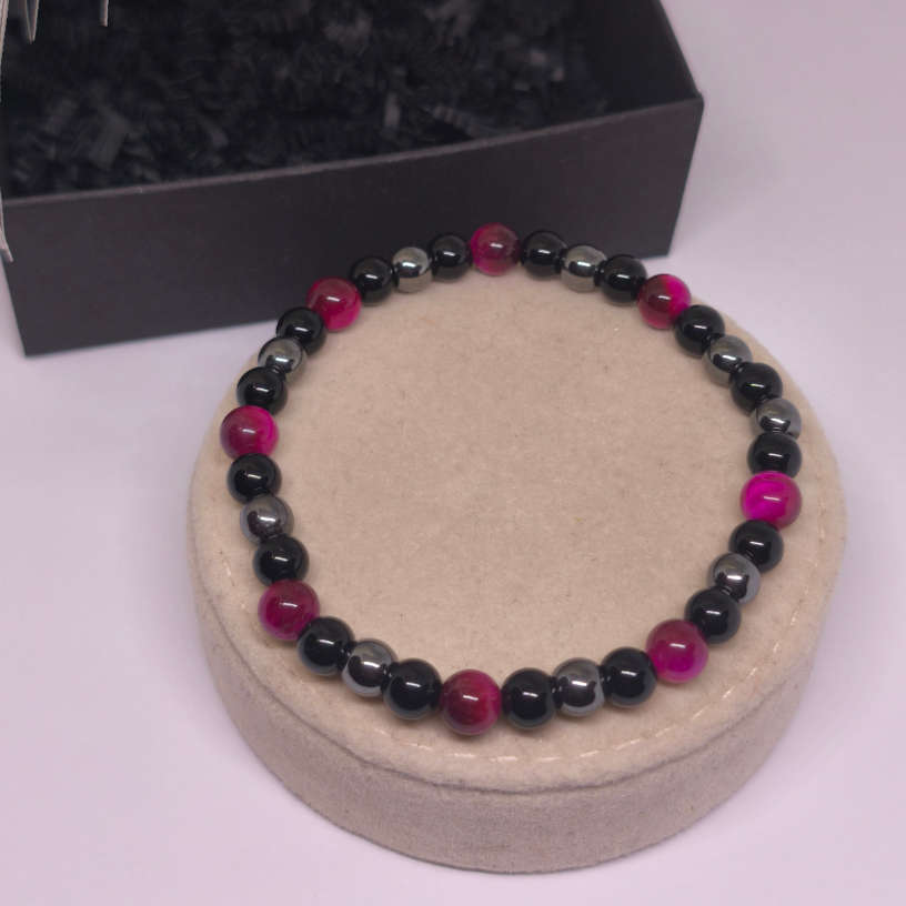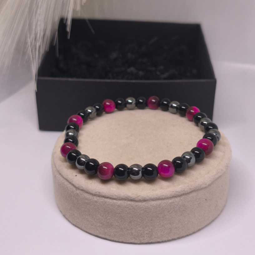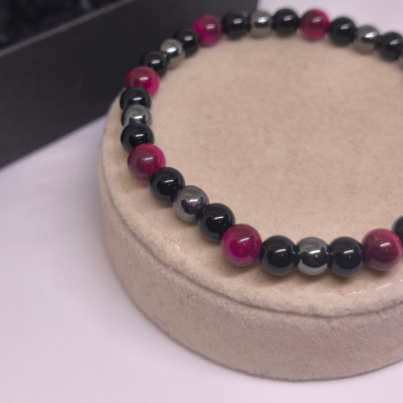 Apyrankės pagrindą sudaro juodi karoliukai, simbolizuojantys vidinę ramybę, stabilumą ir pasitikėjimą savimi. Tamsi spalva suteikia apyrankei universalumo ir leidžia ją derinti tiek prie kasdienės, tiek prie elegantiškesnės aprangos.