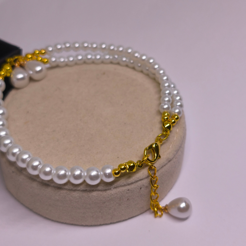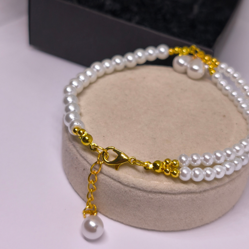 Apyrankė sukurta iš stiklinių perliukų, spindinčių subtiliai baltai, ir aukso spalvos detalių, kurios papuošalui suteikia modernų, elegantišką akcentą.