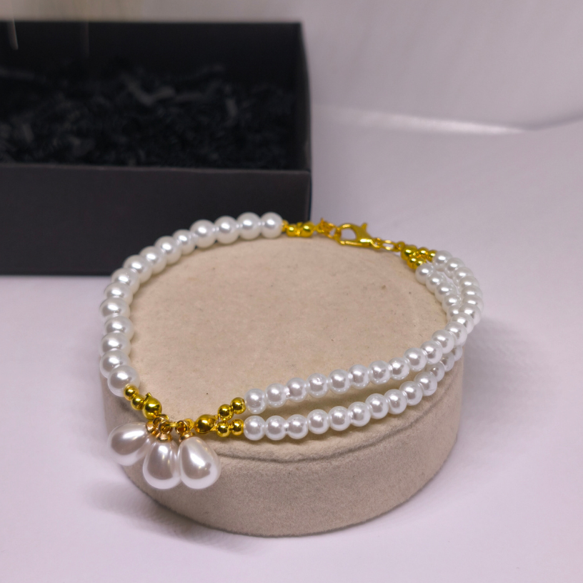 Rankų darbo apyrankė „Baltųjų perlų magija“ – elegantiškas stiklinių perlų karoliukų ir aukso spalvos detalių derinys, sukurtas subtiliam, moteriškam ir prabangiam įvaizdžiui.