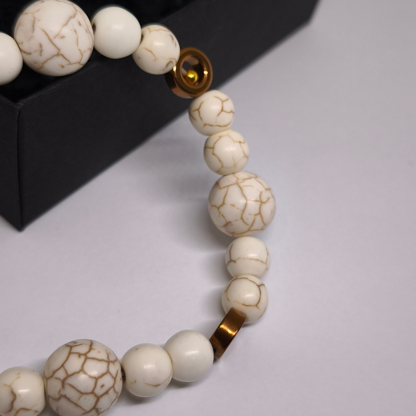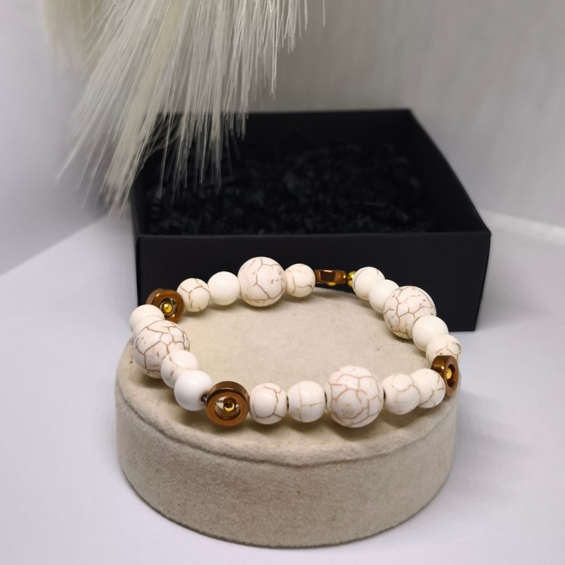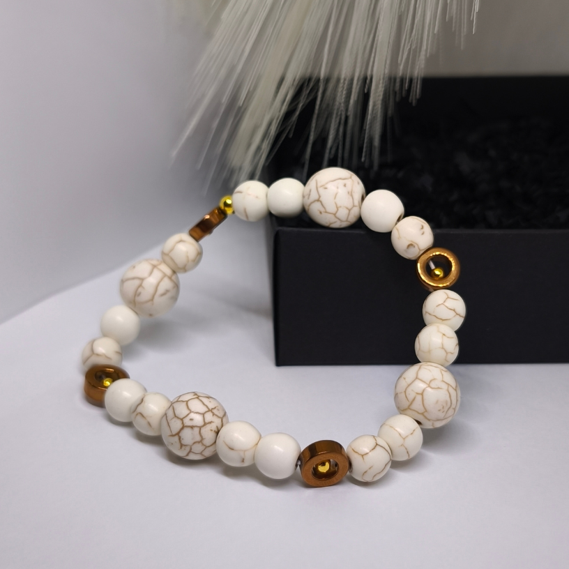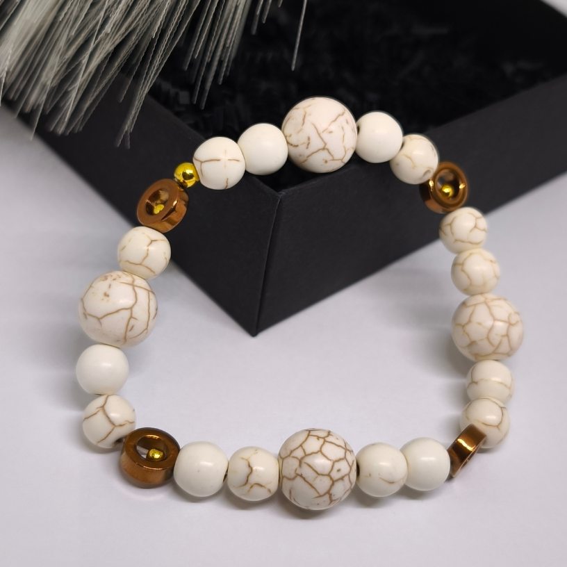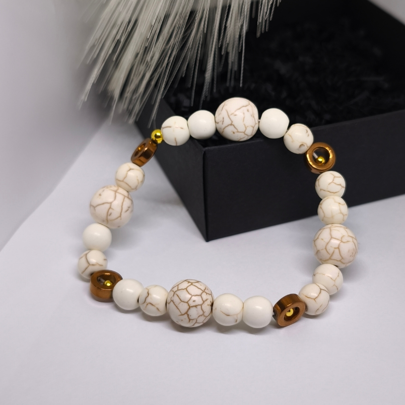 Ši apyrankė sukurta iš kruopščiai parinktų sintetinio hovlito karoliukų, pasižyminčių švelnia, natūralia tekstūra, ir natūralaus hematito akcentų, kurie suteikia subtilaus prabangos spindesio. Šiltų tonų derinys su intarpais sukuria tobulą balansą tarp elegancijos ir natūralumo. 🌿