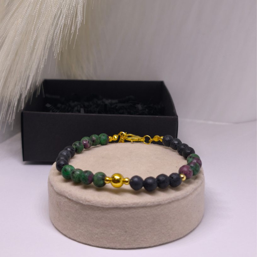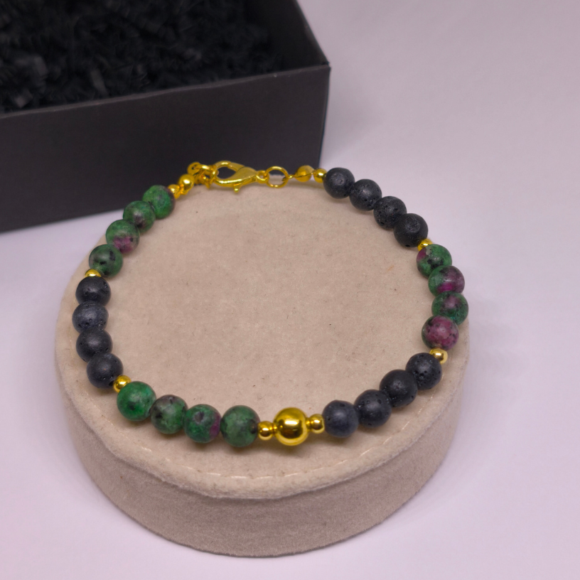 Zoisitas su rubinu išsiskiria žalių ir rausvų atspalvių žaismu, kuris suteikia apyrankei gyvybės. Lavos akmenys švelniai subalansuoja spalvas, sukurdami elegantišką kontrastą.