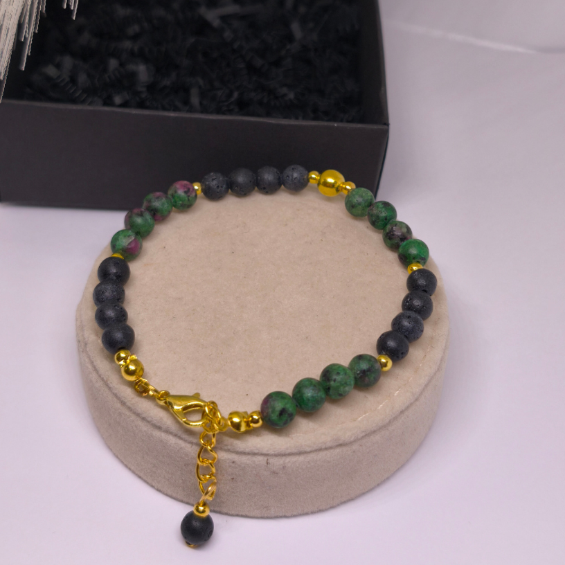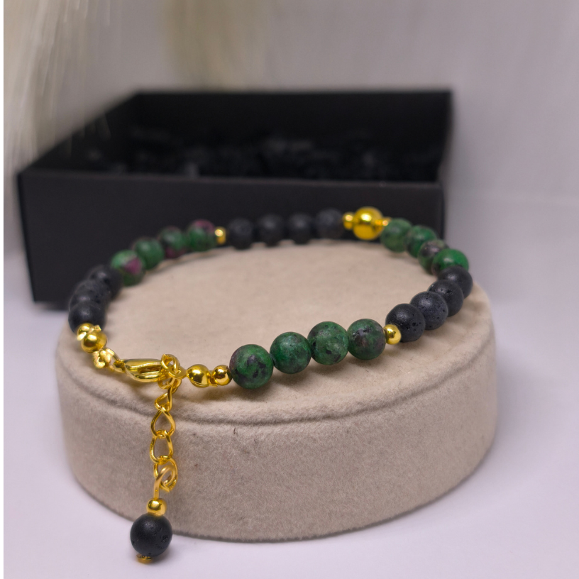 💚 Rankų darbo apyrankė „Zoisito magija“ – tai natūralios energijos ir elegancijos derinys, kuriame susijungia juodos lavos akmenys, zoisitas su rubinu ir subtiliai spindinčios aukso spalvos detalės.