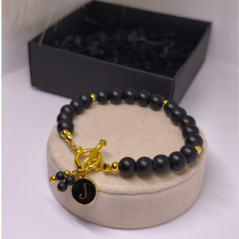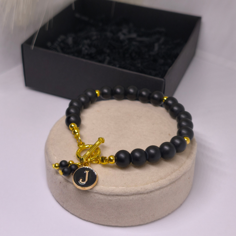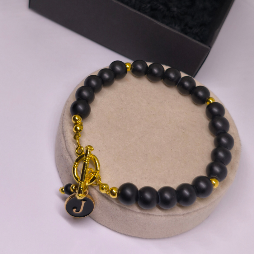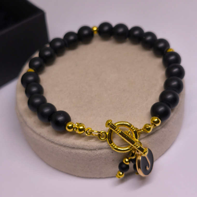 Personalizuota rankų darbo apyrankė „Juodoji prabanga“ – elegantiškas šungito karoliukų ir aukso spalvos detalių derinys su jūsų pasirinkto inicialo pakabuku.