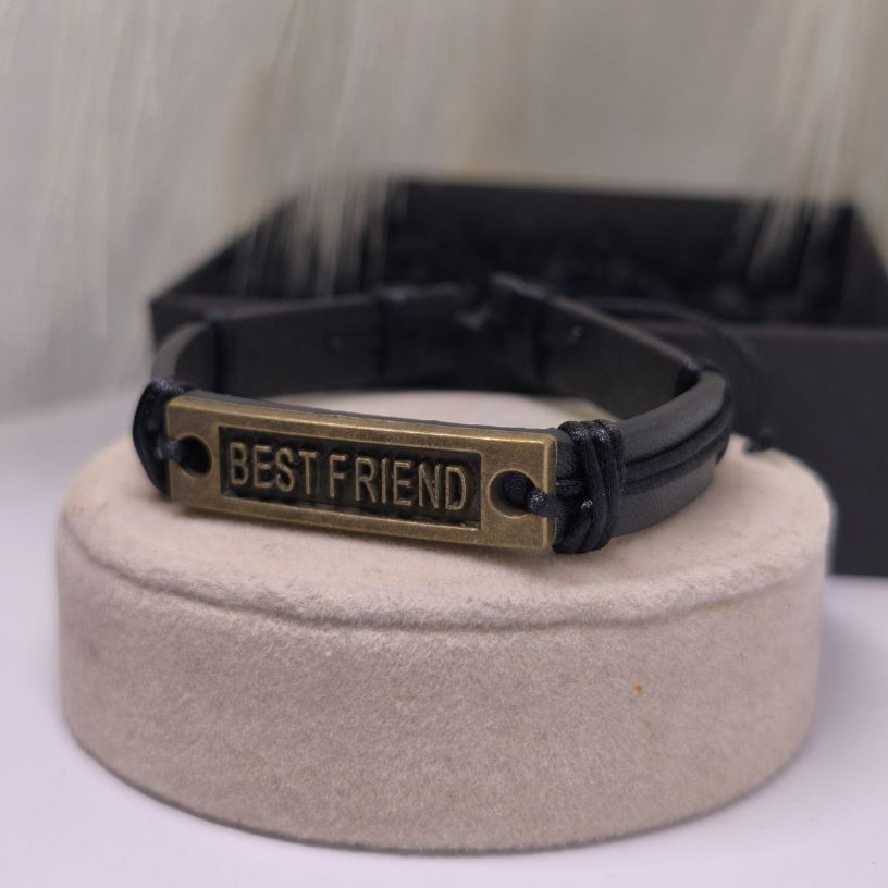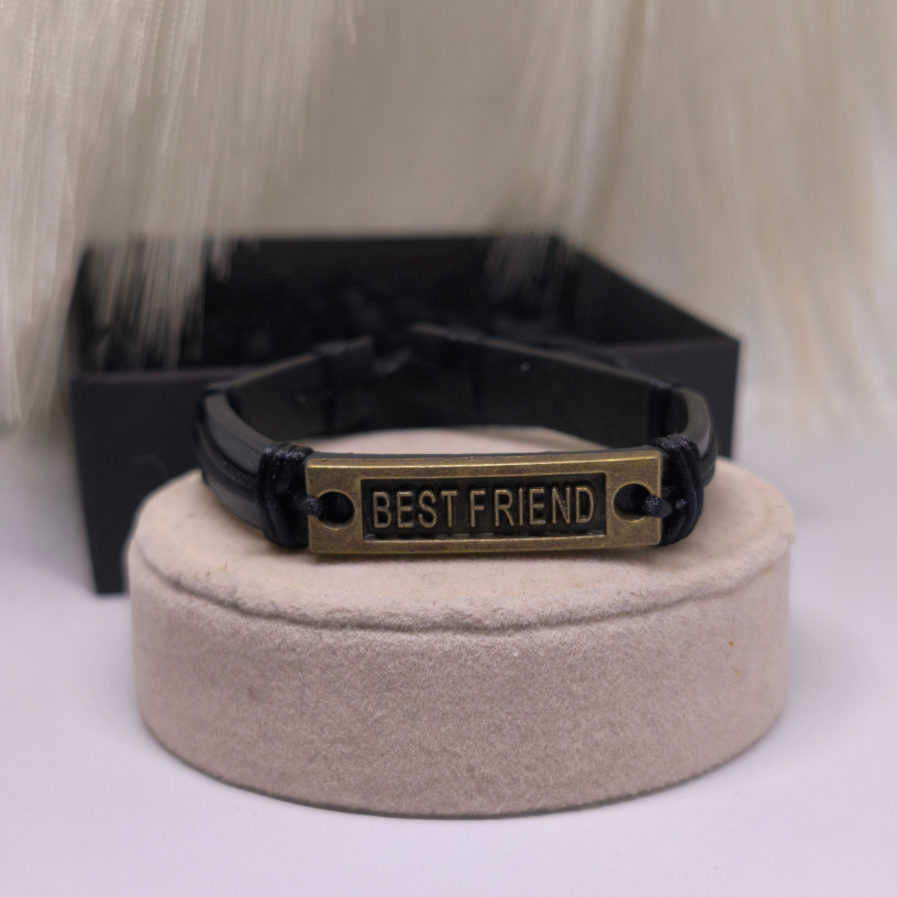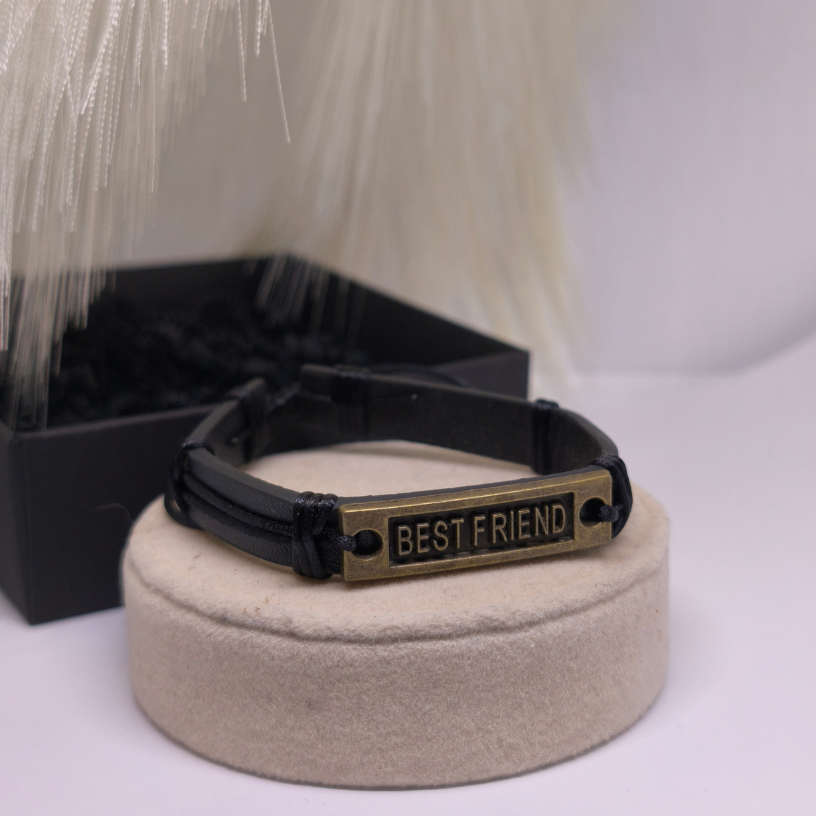 Pagaminta iš juodos odos imitacijos ir puošta sendinto metalo lentele su užrašu „Best Friend“, ši apyrankė išsiskiria tiek prasmingu dizainu, tiek universaliu stiliumi 🌿.