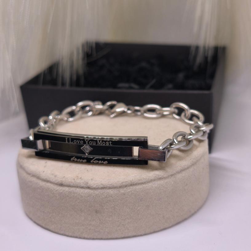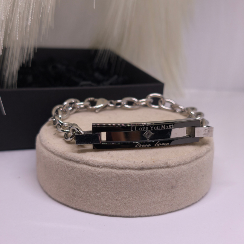 Ant juodos ir sidabrinės plokštelės išgraviruoti žodžiai I Love You Most bei True Love sukuria subtilų, bet jausmingą akcentą 💞. Tai ne tik aksesuaras, bet ir prasminga dovana, simbolizuojanti ryšį tarp dviejų žmonių ❤️.