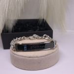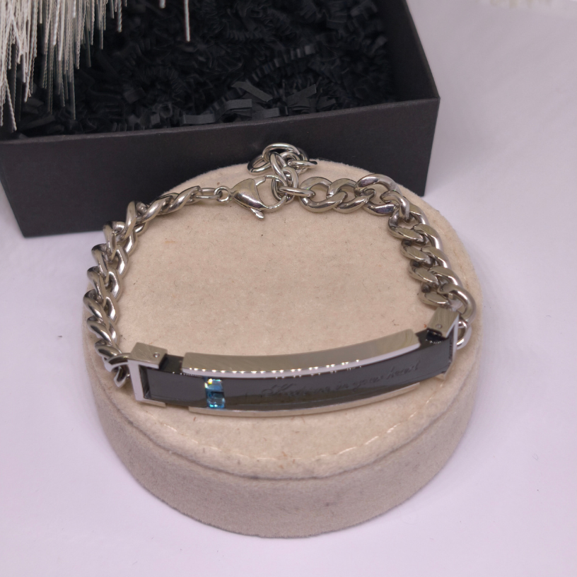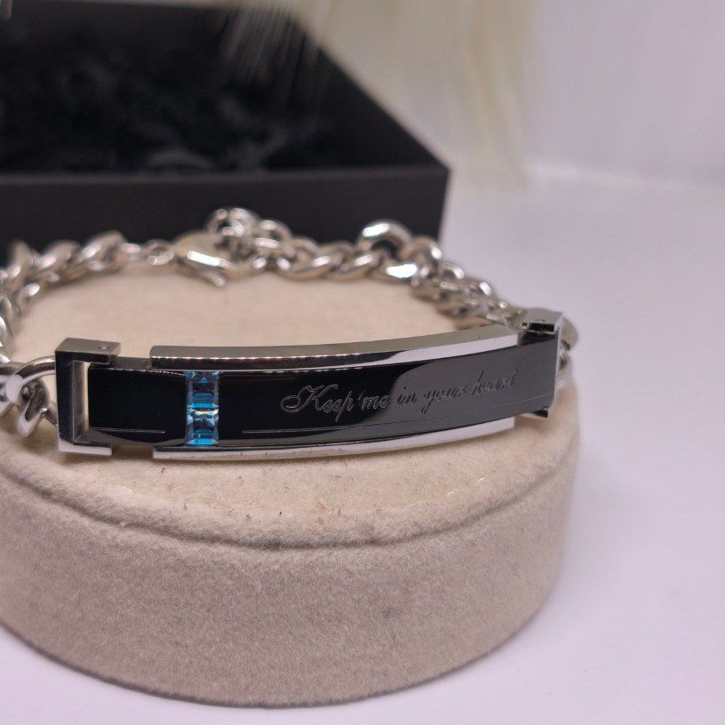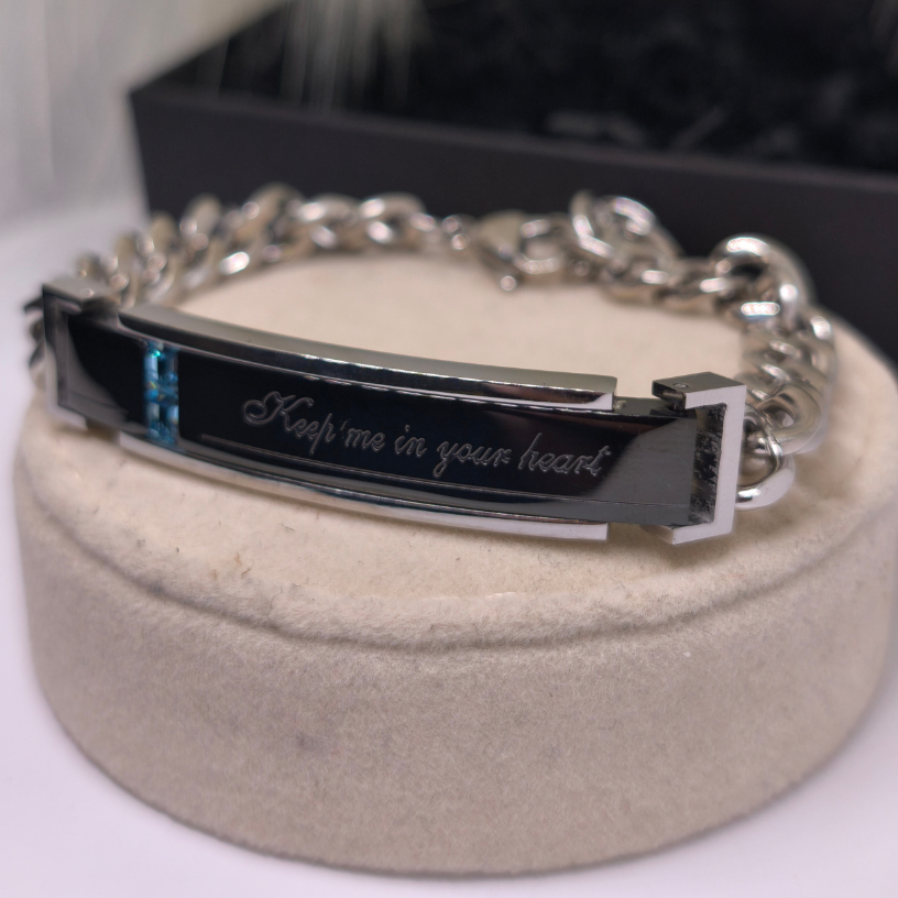 Pagaminta iš aukštos kokybės nerūdijančio plieno, ši apyrankė išsiskiria savo moderniu dizainu – blizgus juodo ir sidabrinio atspalvio derinys, subtilus užrašas „Keep me in your heart“ ir mėlynas akcentas sukuria išskirtinį vizualinį balansą ✨.