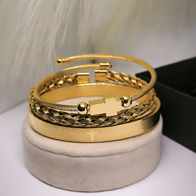 💎 Norite išsiskirti elegantišku ir jaunatvišku įvaizdžiu? Šis trijų apyrankių rinkinys – tobula stiliaus detalė vyrams, kurie mėgsta modernius ir prabangius aksesuarus. Aukso spalvos apyrankės suteikia išskirtinumo, o skirtingi dizainai leidžia jas nešioti tiek kartu, tiek atskirai ir derinti prie įvairių drabužių.