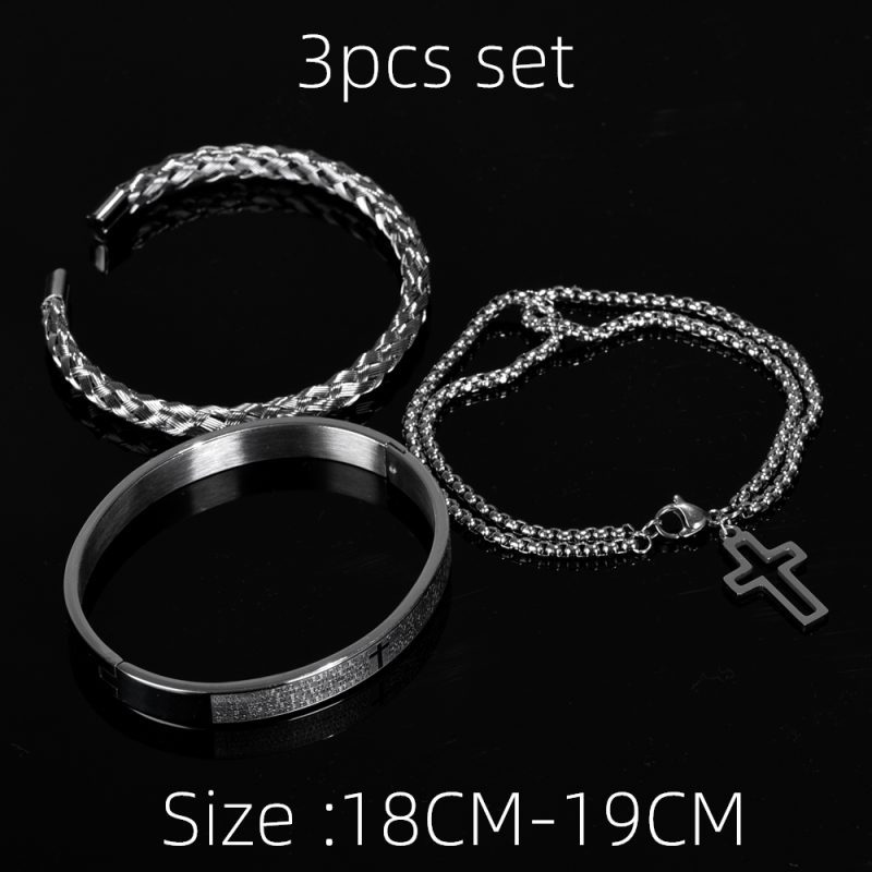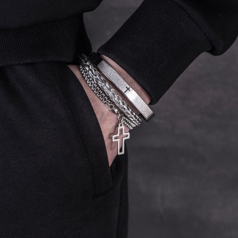 Madingų apyrankių rinkinys su kryžiaus formos pakabučiu – išskirtinis ir stilingas aksesuaras, suteikiantis įvaizdžiui ryškumo. Pagamintas iš nerūdijančio plieno, todėl yra ilgaamžis ir patogus dėvėti. Ilgis: 19 cm, 2 iš 3 apyrankių turi reguliuojamą dydį.