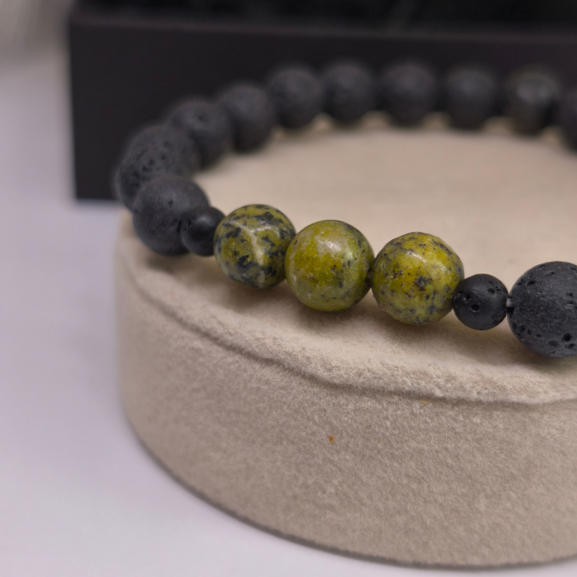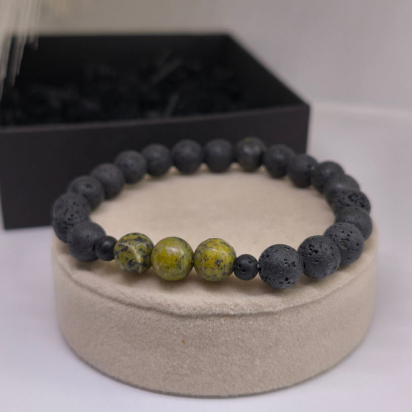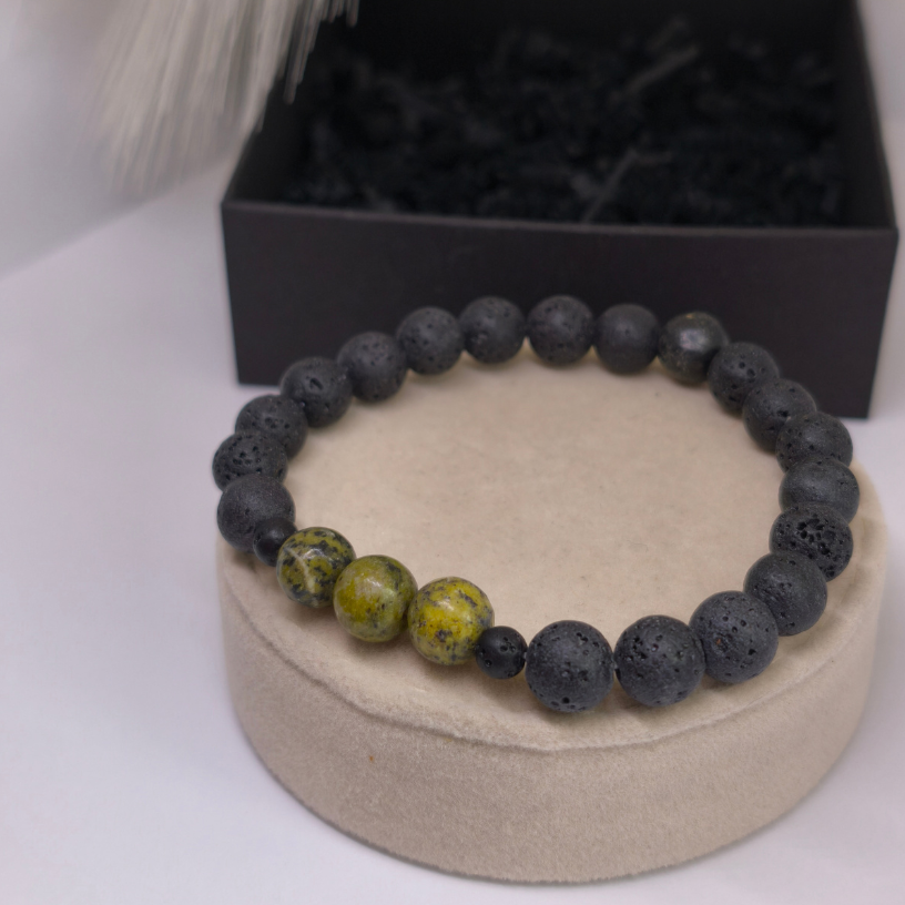 Ši apyrankė sukurta derinant du stiprius natūralius elementus – juodą lavos akmenį ir geltonąjį turkį. Tamsi, matinė lava suteikia solidumo ir vyriškumo, o ryškūs geltonojo turkio akcentai įneša gyvybingumo bei išskirtinumo. 🖤💛