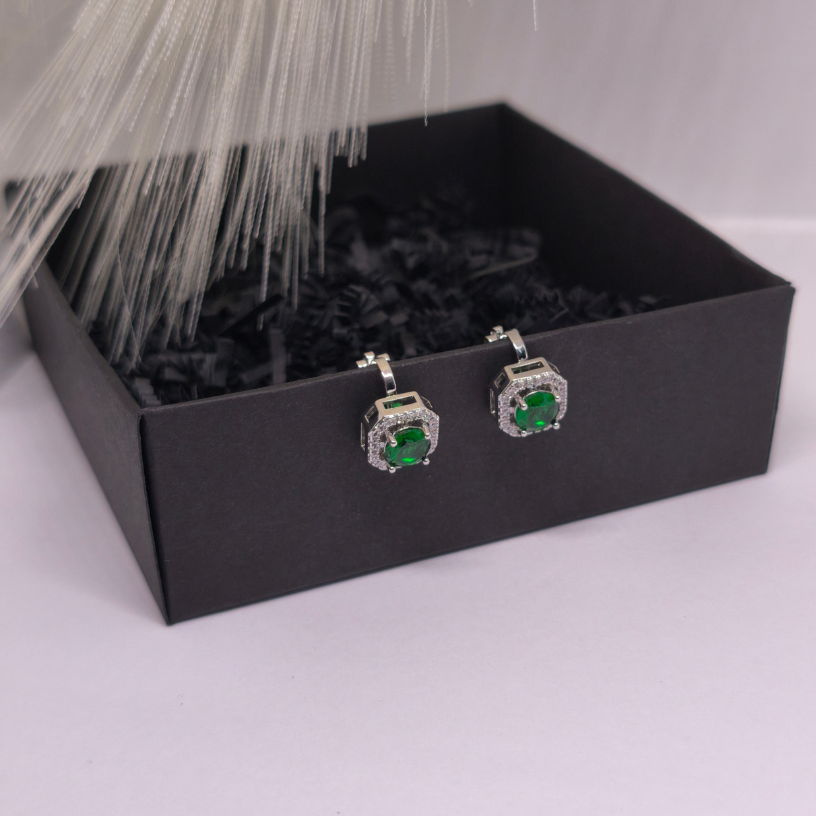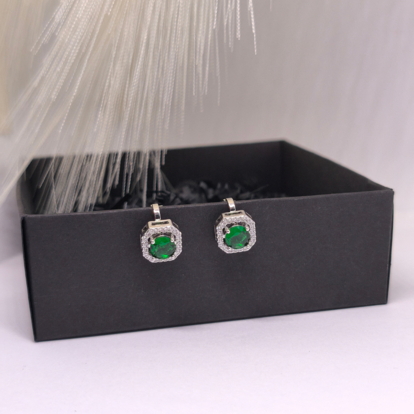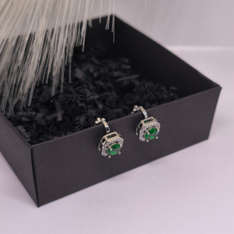 Sodriai žalias akmuo, įrėmintas spindinčiais kristalais, sukuria išskirtinį „halo“ efektą, primenantį karališkųjų papuošalų estetiką.