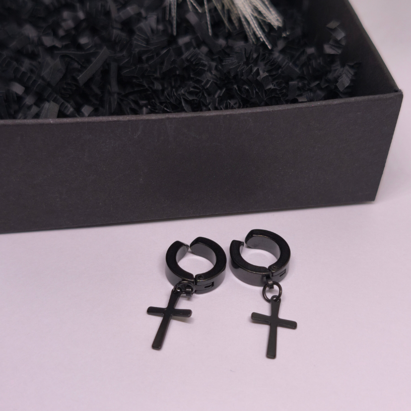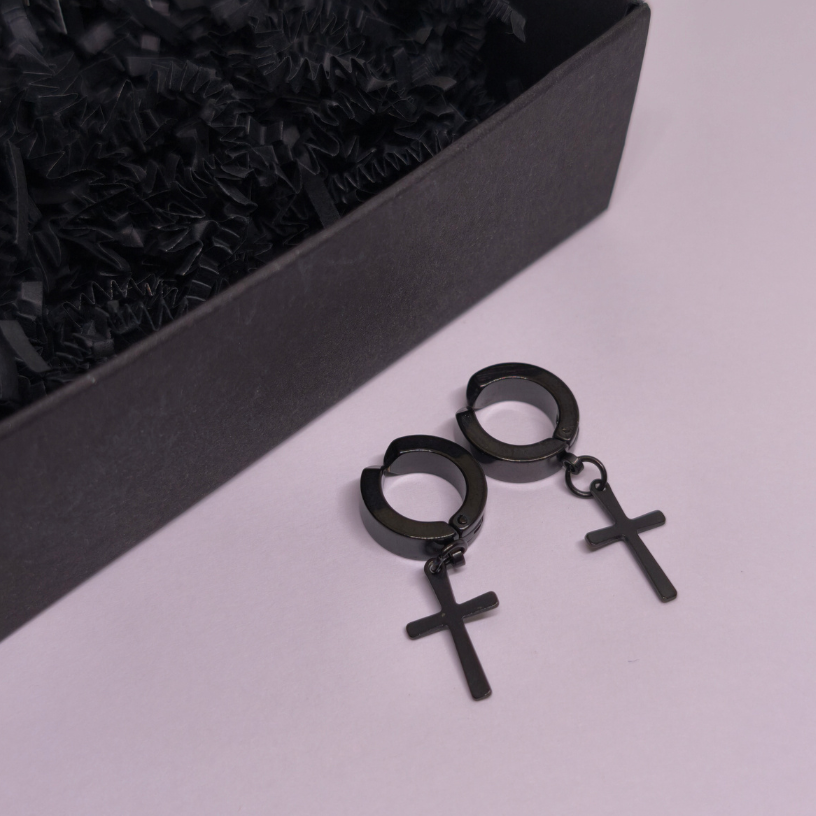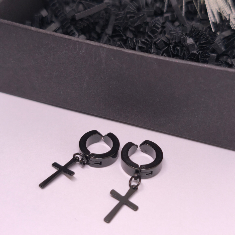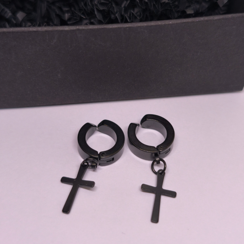 Šie juodo plieno klipsai su kryžiaus formos pakabuku puikiai tinka tiek vyrams, tiek moterims, mėgstantiems subtilų, bet drąsų akcentą. ✝️