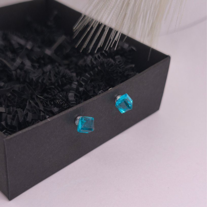 Magnetiniai auskarai „Akvamarino kubai“ – kubo formos, akvamarino mėlio spindesio. Patogūs auskarai be pradūrimo su tvirtu magnetiniu užsegimu, tinkantys kasdienai ir šventei. Minimalistinis dizainas išryškina veido bruožus ir dera prie įvairių stilių.