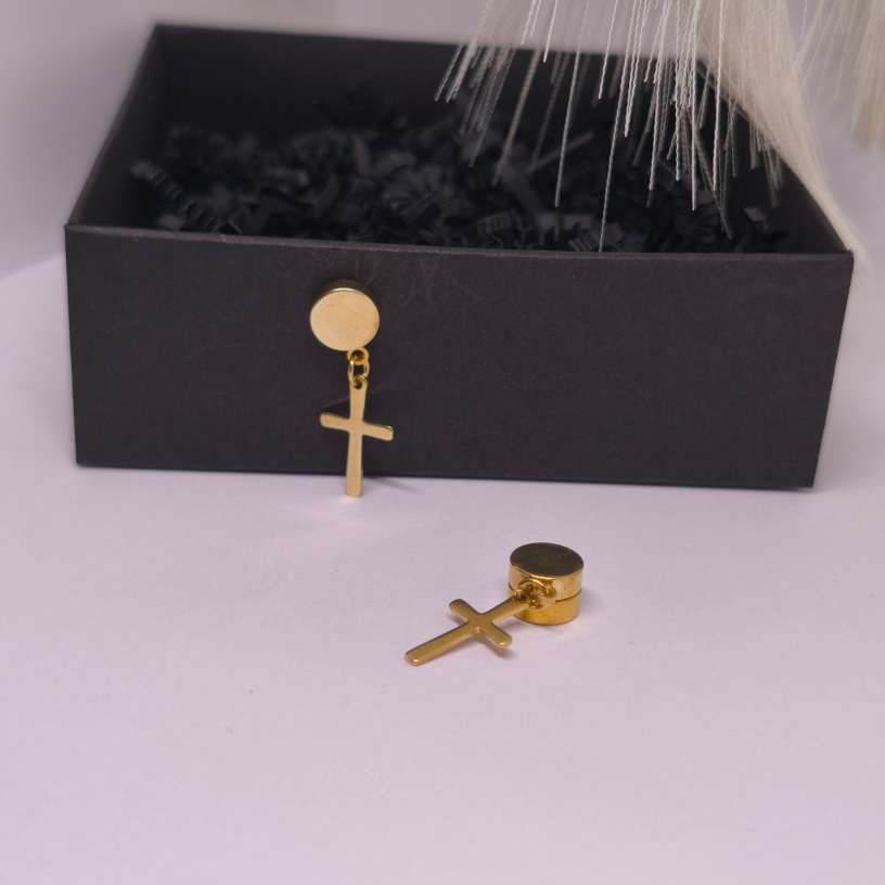 Magnetiniai auskarai „Šviesos ženklas“ – auksinės spalvos auskarai be pradūrimo su kryžiaus pakabuku. Tvirtas magnetinis užsegimas, minimalistinis unisex dizainas kasdienai ir vakarui, lengvai derinami su įvairiais stiliais.