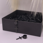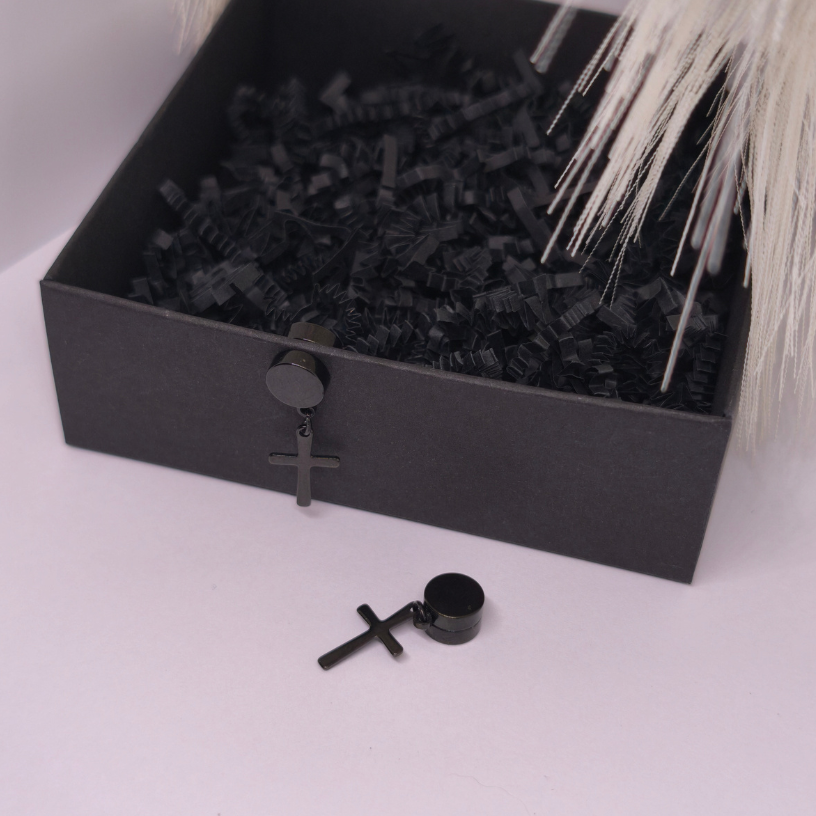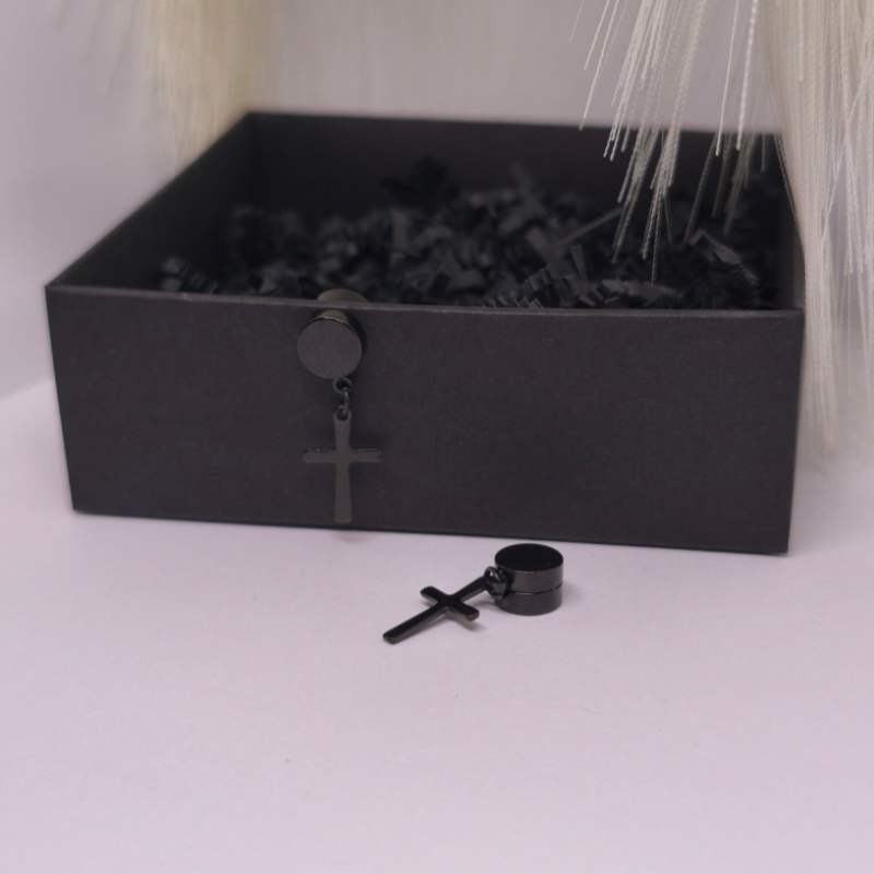 Magnetiniai auskarai „Tamsos ženklas“ – juodos spalvos minimalistiniai auskarai be pradūrimo su kryžiaus formos pakabuku. Tvirtas magnetinis užsegimas, patogus kasdienai ir vakarui, unisex dizainas, derantis prie street, grunge ar klasikinio stiliaus.