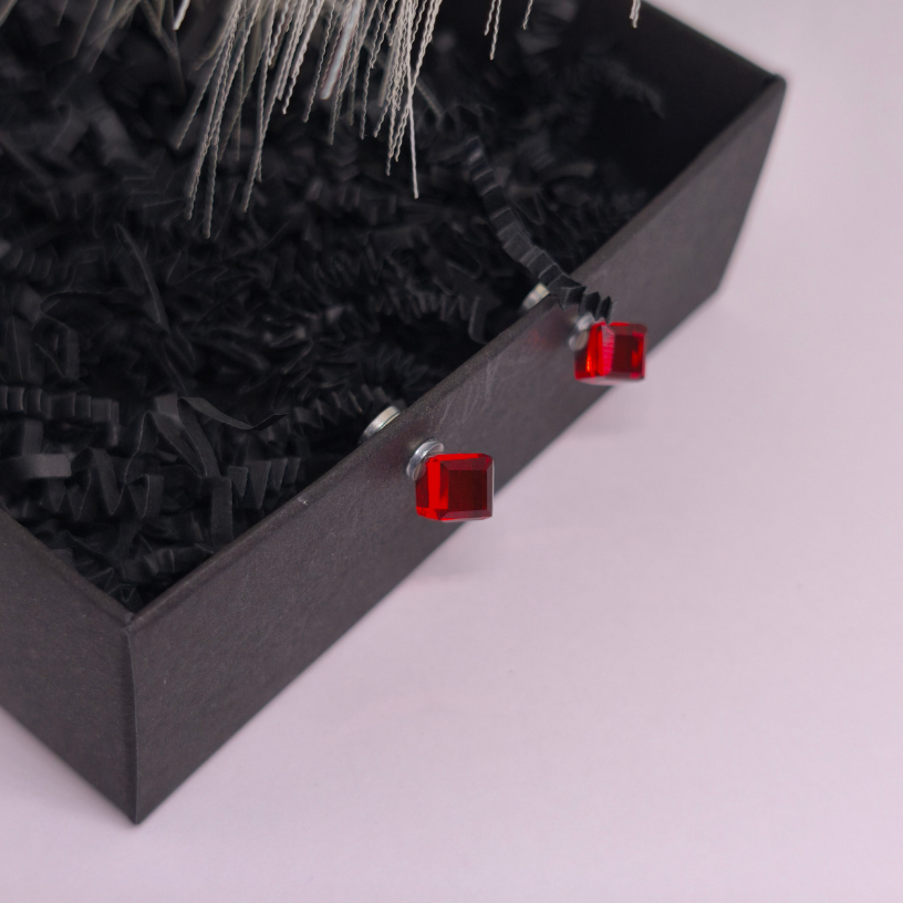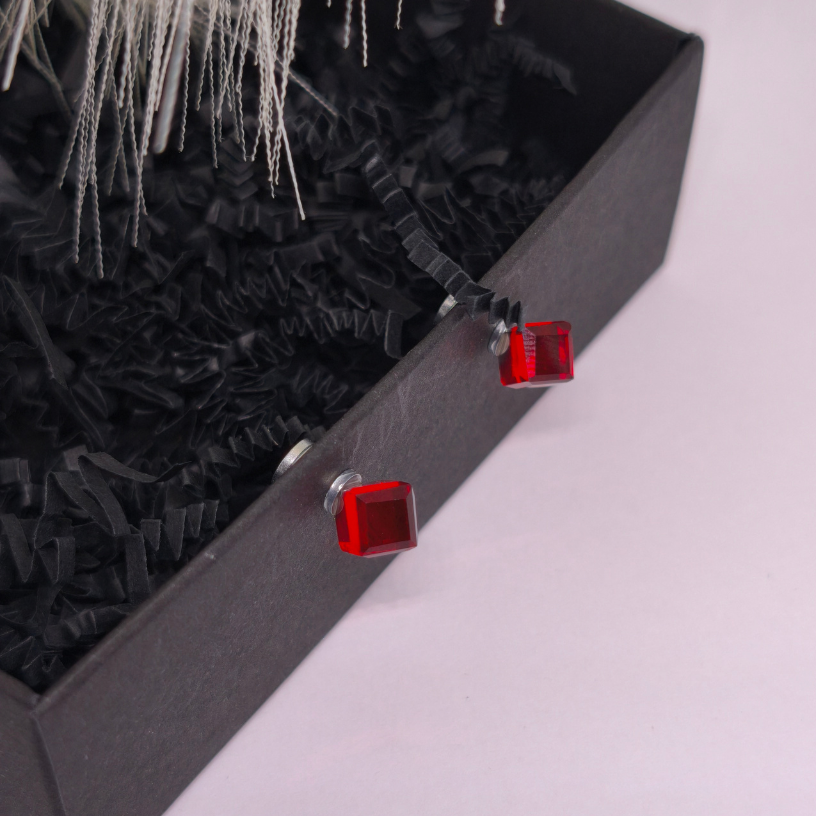Magnetiniai auskarai „Ugnies kristalai“ – ryškiai raudono stiklo kubo formos auskarai su patogiu magnetiniu užsegimu be ausų pradūrimo. Stilingas, modernus ir išskirtinai spindintis aksesuaras.