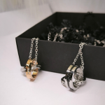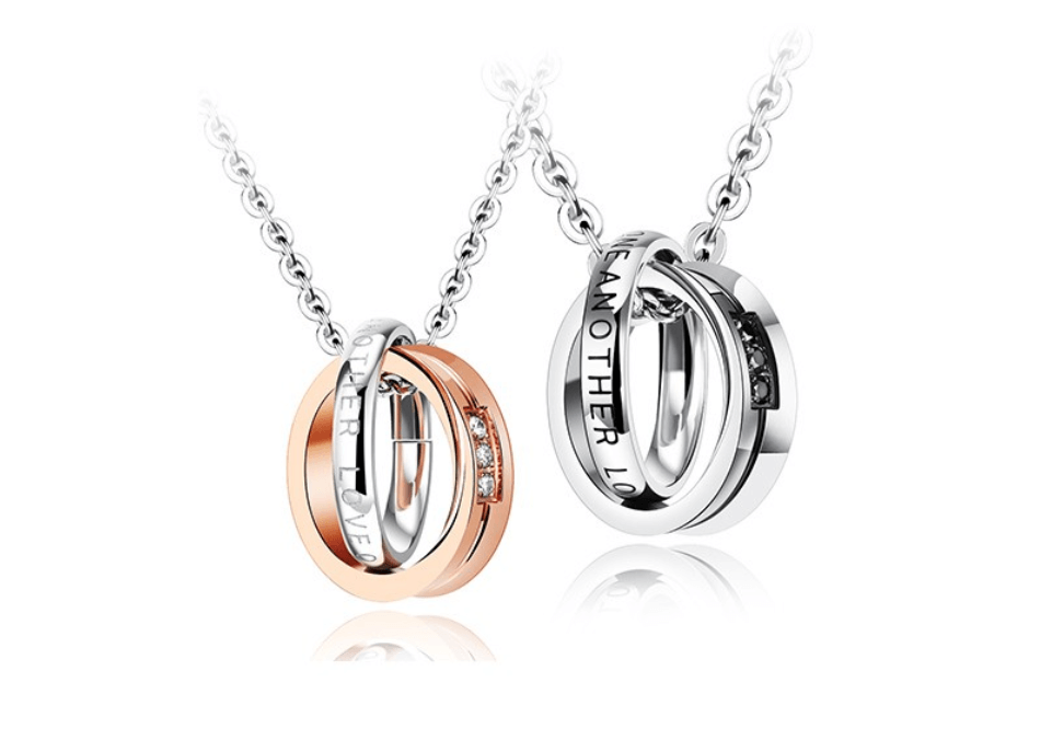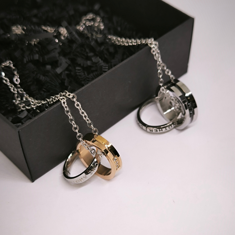 Šis ypatingas kaklo papuošalų rinkinys porai yra sukurtas tam, kad kiekviena akimirka kartu būtų ypatinga. 💑 Rinkinyje rasite du vienetai grandinėlių ir du vienetai kaklo pakabukų, kurių kiekvienas pagamintas iš aukštos kokybės nerūdijančio plieno ir puošti spindinčiais cirkonio kristalais. 🌟 Moteriškasis aksesuaras išsiskiria aukso spalvos žiedeliu, o vyriškasis – sidabro spalvos žiedeliu, suteikiančiu prabangos ir stiliaus pojūtį. ✨