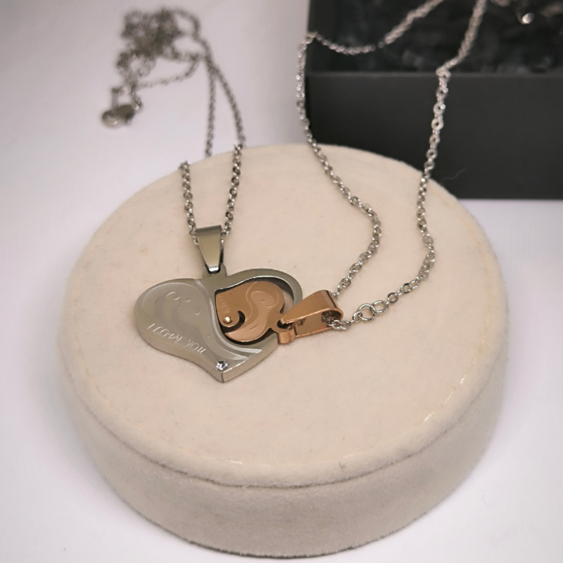 Šie unikalūs papuošalai buvo sukurti tam, kad simbolizuotų dviejų žmonių meilę ir ryšį. Rinkinį sudaro dvi sidabro spalvos grandinėlės ir du kaklo pakabukai, kurie susijungę sudaro širdelę. Ant pakabukų išgraviruoti žodžiai „I love you“ ir „Love“, kurie primins jums apie jūsų jausmų stiprumą. 🌟