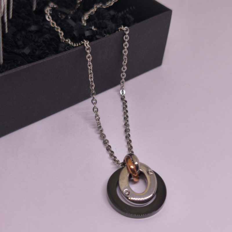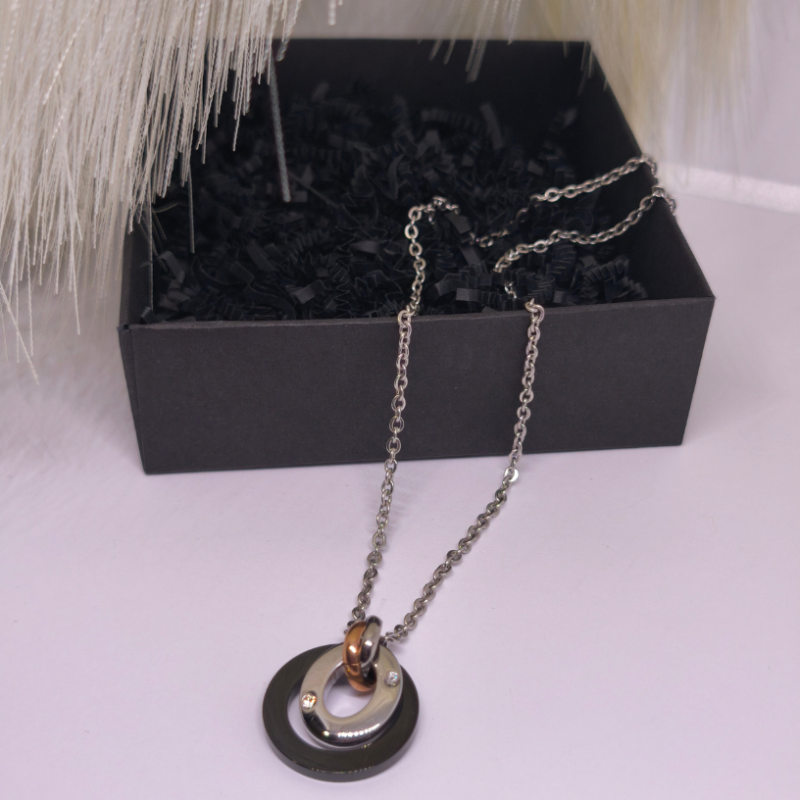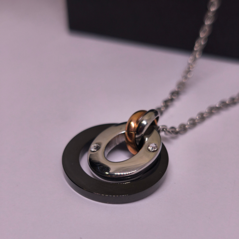 💎 Kaklo papuošalas „Gyvenimo ratas“ – tai modernus ir prasmingas aksesuaras, įkūnijantis harmoniją, stiprybę ir amžiną gyvenimo tėkmę 🌗. Jo išskirtinis trijų tonų dizainas – sidabro, juodo ir rožinio aukso atspalviai – simbolizuoja praeitį, dabartį ir ateitį, primindami, kad viskas gyvenime susiję tarpusavyje 🔄.