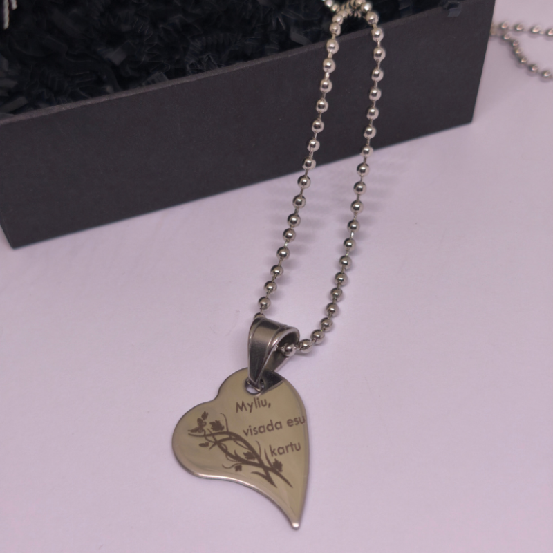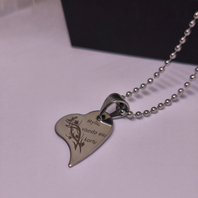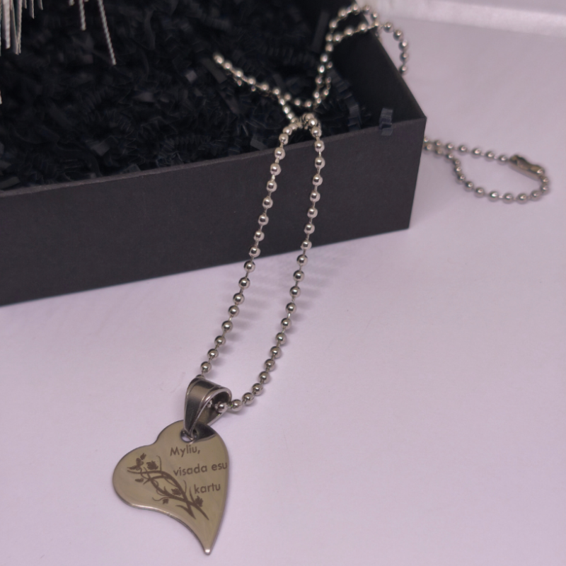 Pakabukas pagamintas iš aukštos kokybės nerūdijančio plieno, todėl yra ilgaamžis, atsparus įbrėžimams ir neišblunkantis 🌟. Ant jo graviruotas užrašas „Myliu, visada esu kartu“ simbolizuoja meilę, ištikimybę ir amžiną ryšį tarp dviejų žmonių 💍.