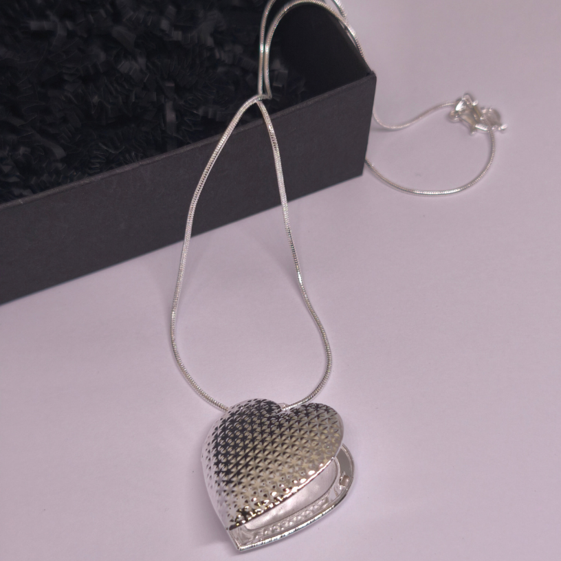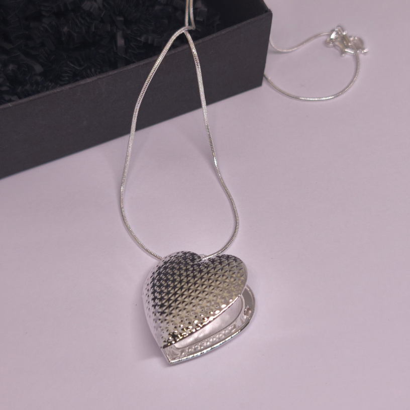 Medalionas „Tylus jausmas“ – elegantiškas, širdies formos sidabrinės spalvos medalionas, skirtas saugoti brangius prisiminimus. Subtilus faktūrinis paviršius ir atsidaranti konstrukcija paverčia jį prasmingu akcentu kasdieniam stiliui ir ypatingoms progoms.