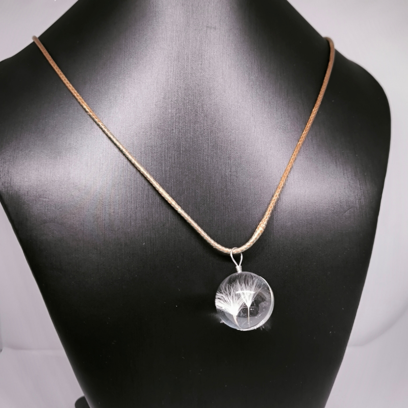 Šis vienetinis rankų darbo kaklo papuošalas yra unikalus savo konstrukcija, kurią sudaro ruda virvutė ir didelis stiklo karoliukas. Viduje rasite pienės pūkelį, kuris suteikia papuošalui ypatingo žavesio ir jaukumo. 🌿