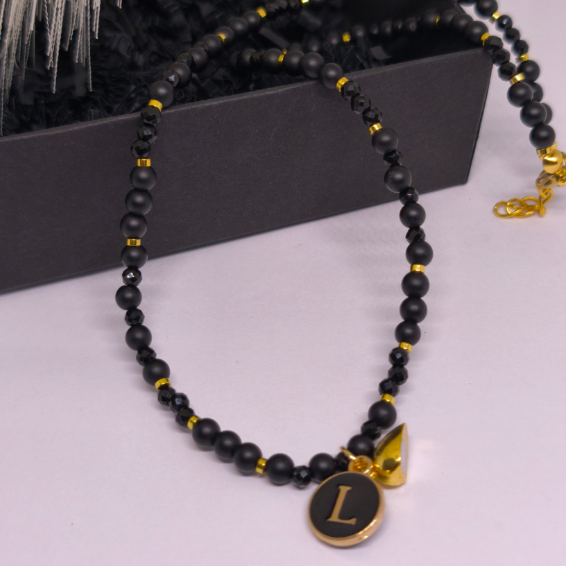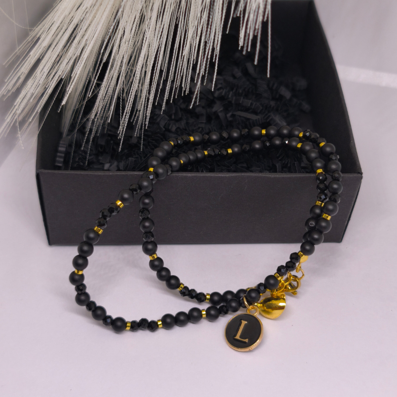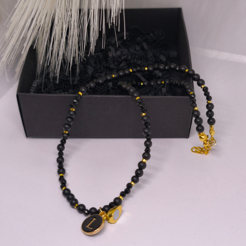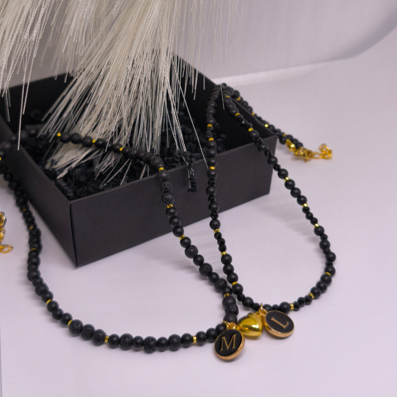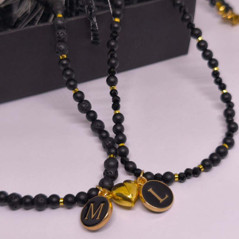 Papuošalas pagamintas iš šungito ir stiklo karoliukų, papildytas aukso spalvos detalėmis bei magnetiniu pusės širdelės pakabuku, kuris susijungia su vyriška versija. Tai subtilus, bet labai stiprus simbolis, primenantis, kad esate susieti – net ir būdami atskirai. 🤍✨