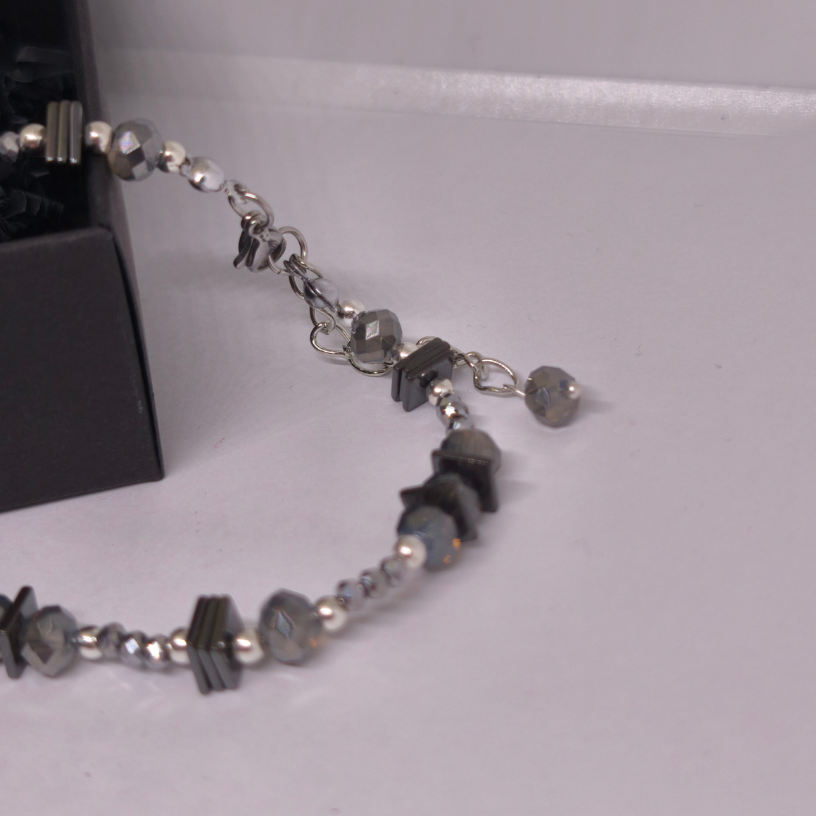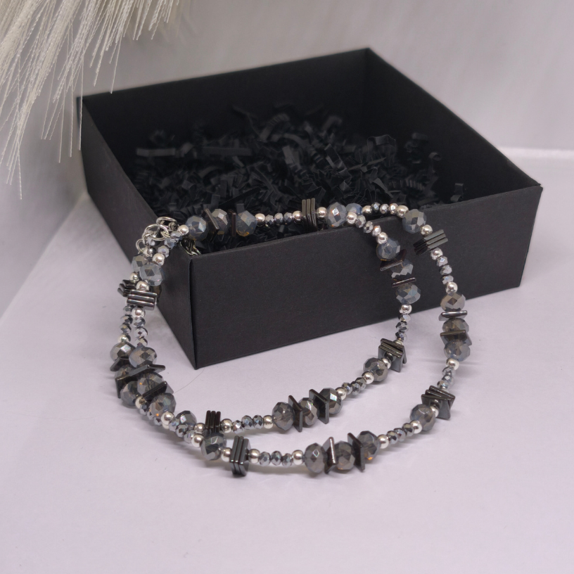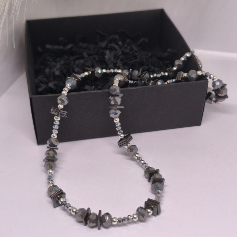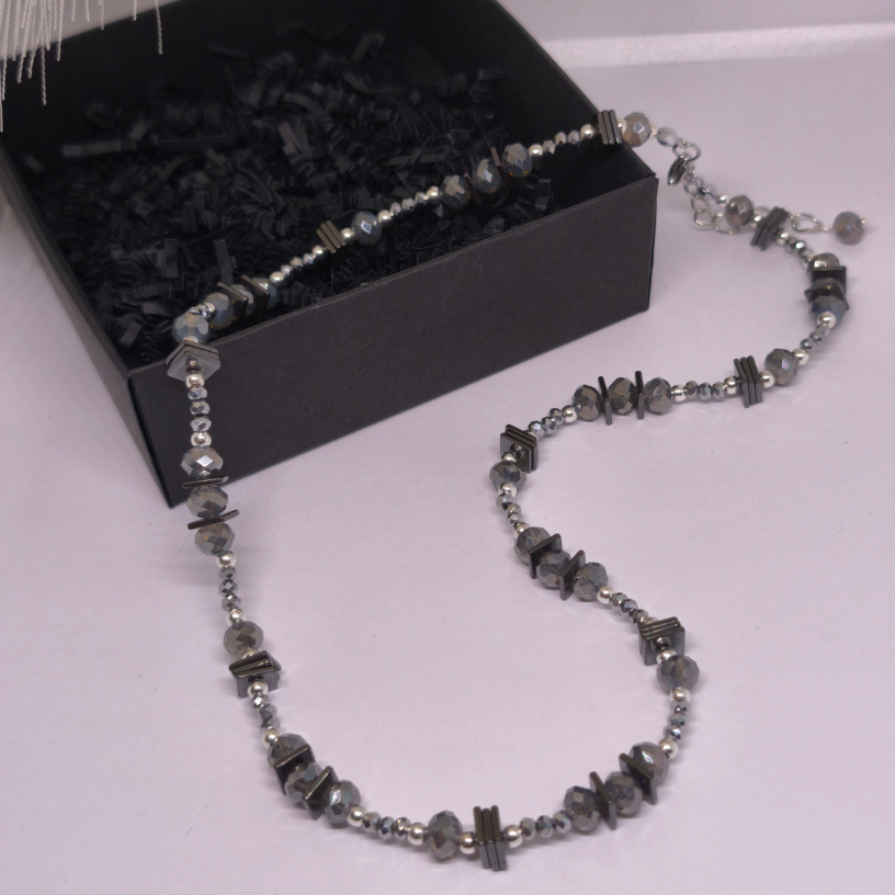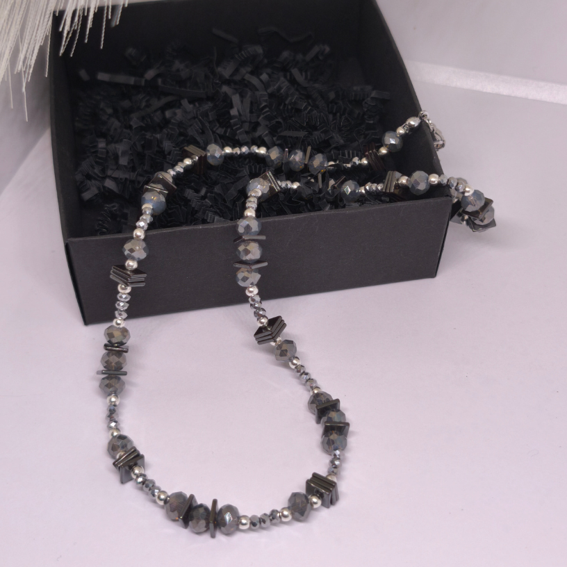 Rankų darbo kaklo papuošalas „Grafito švytėjimas“ – modernus ir elegantiškas aksesuaras, kuriame dera stiklo kristalų spindesys, hematito plokštelių charakteris ir sidabro spalvos detalės. Subtilus, bet išraiškingas papuošalas moteriai, vertinančiai stilių ir kokybę.