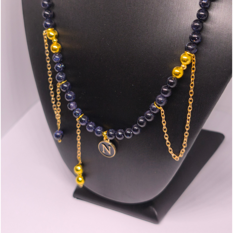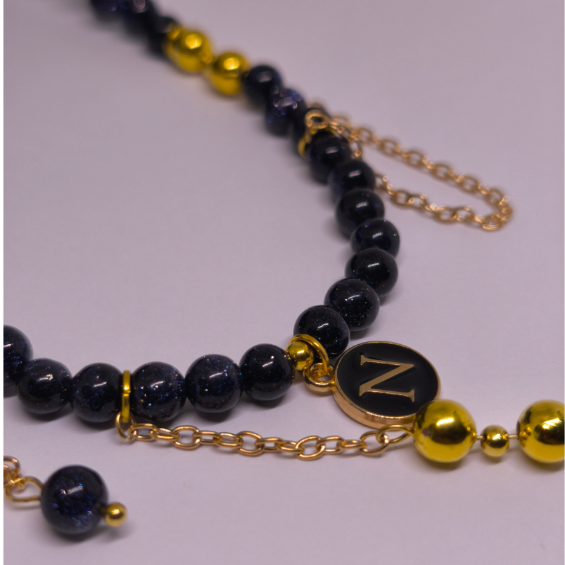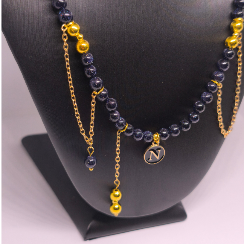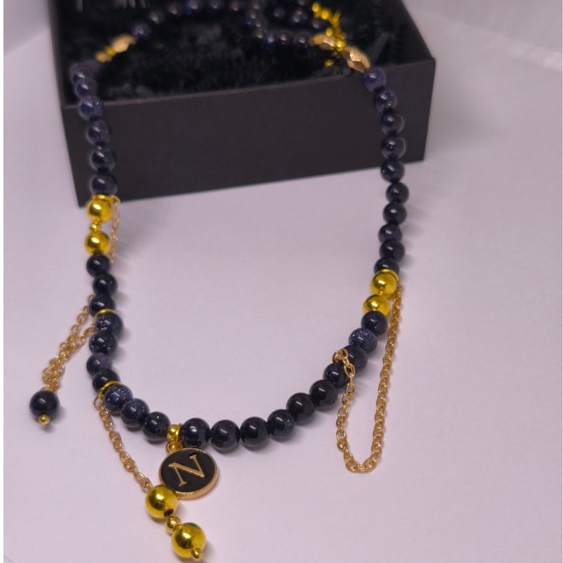 Papuošalas puoštas subtiliomis auksinėmis detalėmis ir grandinėlėmis, kurios harmoningai dera su tamsiai mėlyna akmens spalva. Kartu su personalizuotu pakabuku, jis tampa ne tik stiliaus, bet ir asmeninės reikšmės simboliu 💫.