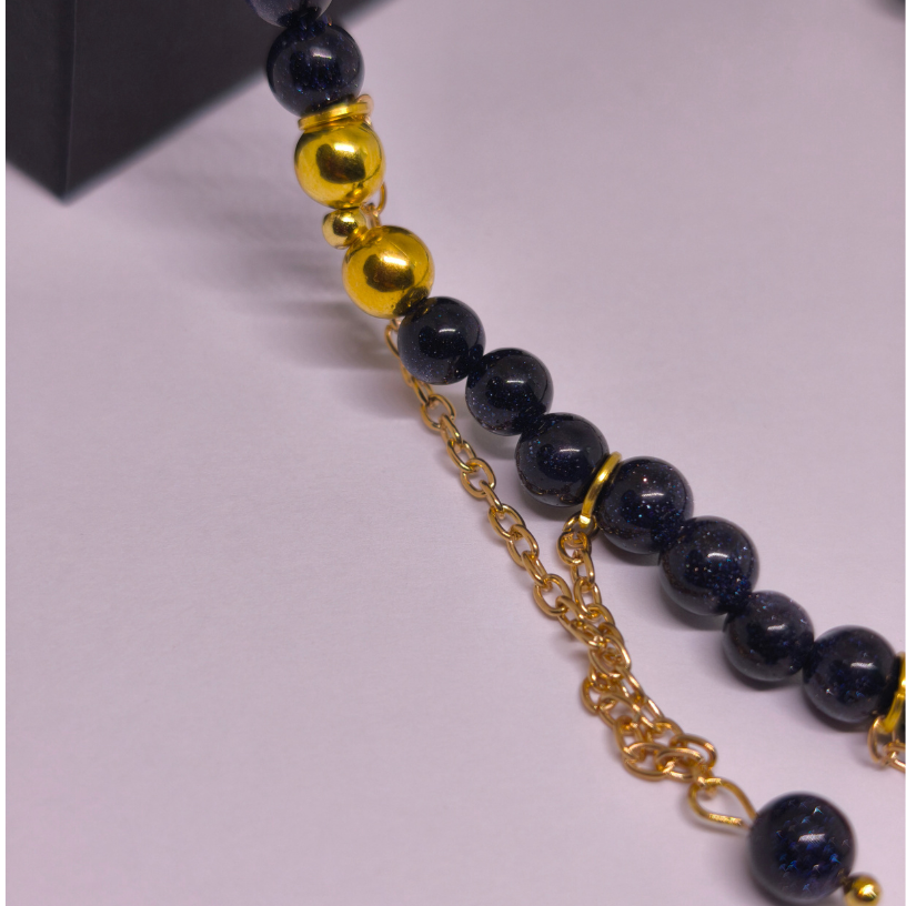 Atraskite unikalų stiliaus akcentą – rankų darbo kaklo papuošalą „Kairo paslaptis“, sukurtą iš žvaigždėtai žvilgančių Kairo nakties (Blue Sandstone) akmenukų. Šis akmuo laikomas sėkmės ir įkvėpimo simboliu, primenančiu tamsų Egipto dangų, nusėtą tūkstančiais mažų švieselių ✨.
