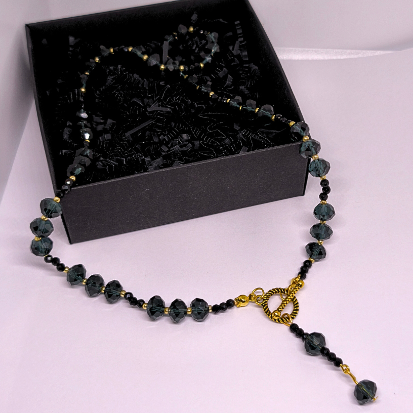 Papuošalas pagamintas iš mėlynų ir juodų stiklinių kristalų, dekoruotų auksinės spalvos akcentais, kurie suteikia papildomo spindesio ir karališko žavesio.