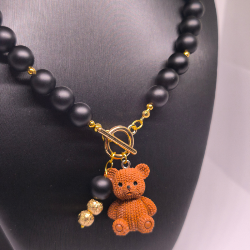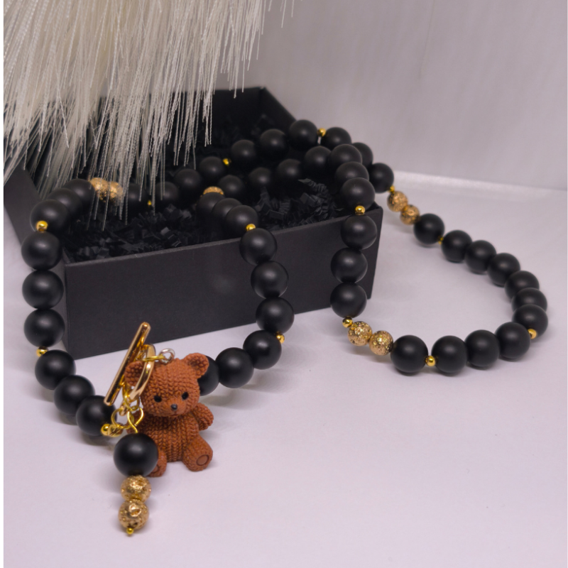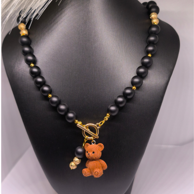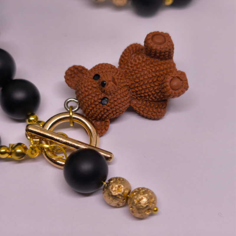 Atraskite papuošalą, kuriame susilieja gamtos energija ir išskirtinis dizainas. ✨ „Meškiuko elegancija“ – tai rankų darbo kaklo papuošalas, sukurtas iš natūralaus šungito karoliukų, papildytas auksinės spalvos detalėmis ir mielu meškiuko pakabuku.