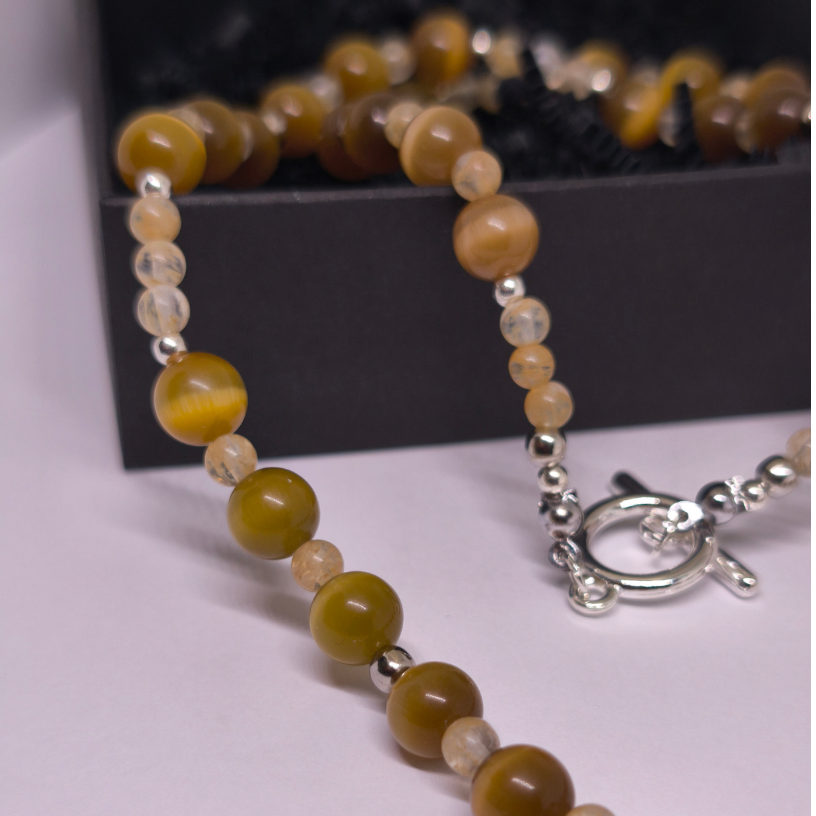 - Naudoti natūralūs akmenys: katės akis ir rutilo kvarcas ✨