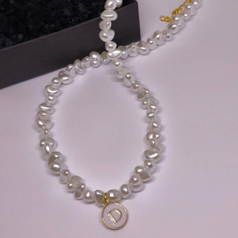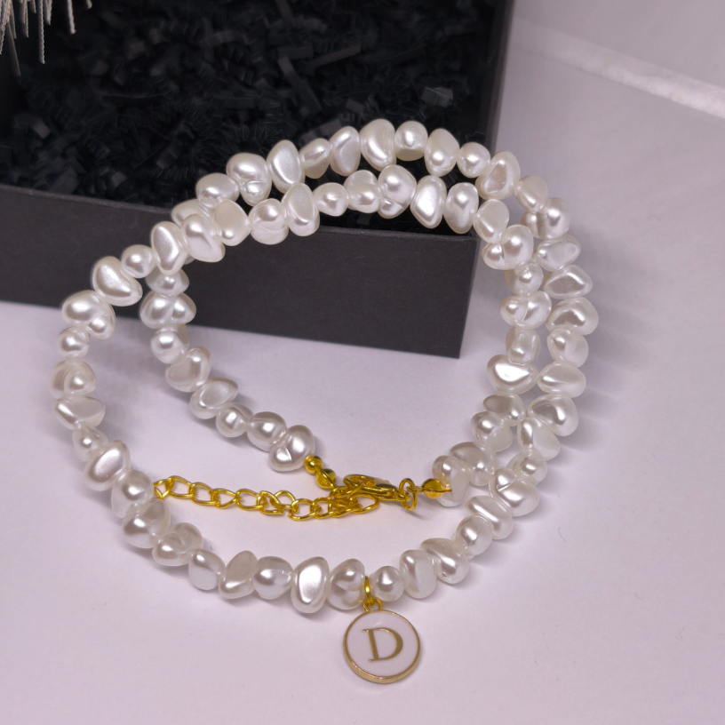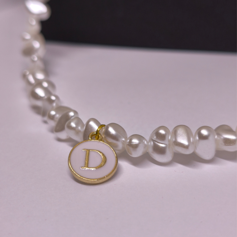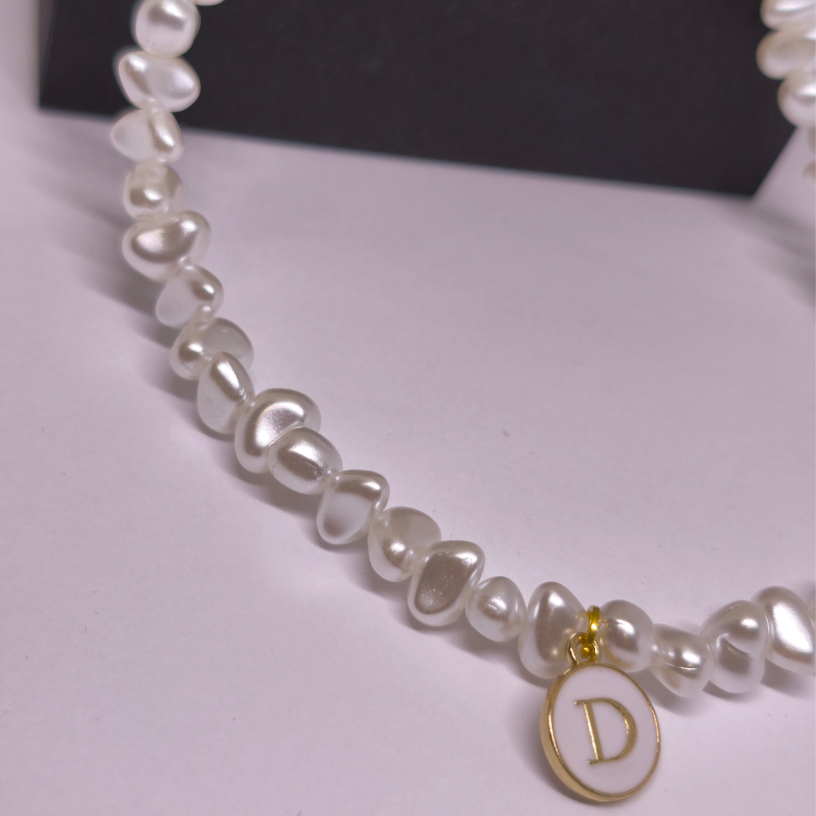 Vėrinys pagamintas iš netaisyklingų baltų perlų imitacijos karoliukų, kurie suteikia natūralumo bei išskirtinumo. Auksinės spalvos detalės ir personalizuotas inicialo pakabukas leidžia papuošalui sukurti ryšį su savininke – tarsi nedidelė, bet prasminga asmeninė istorija. 💛🔠