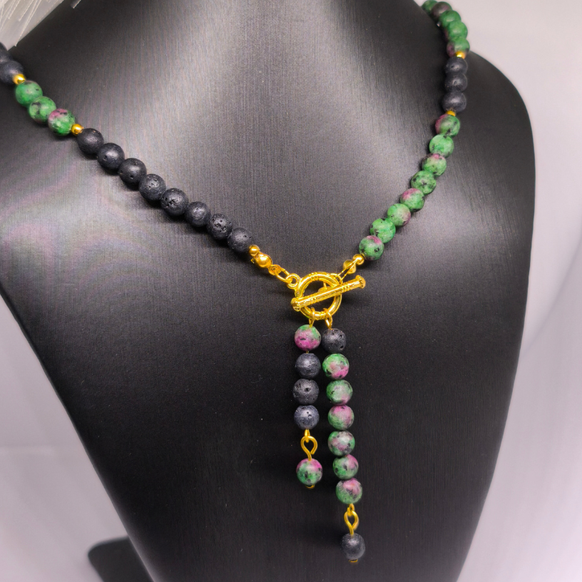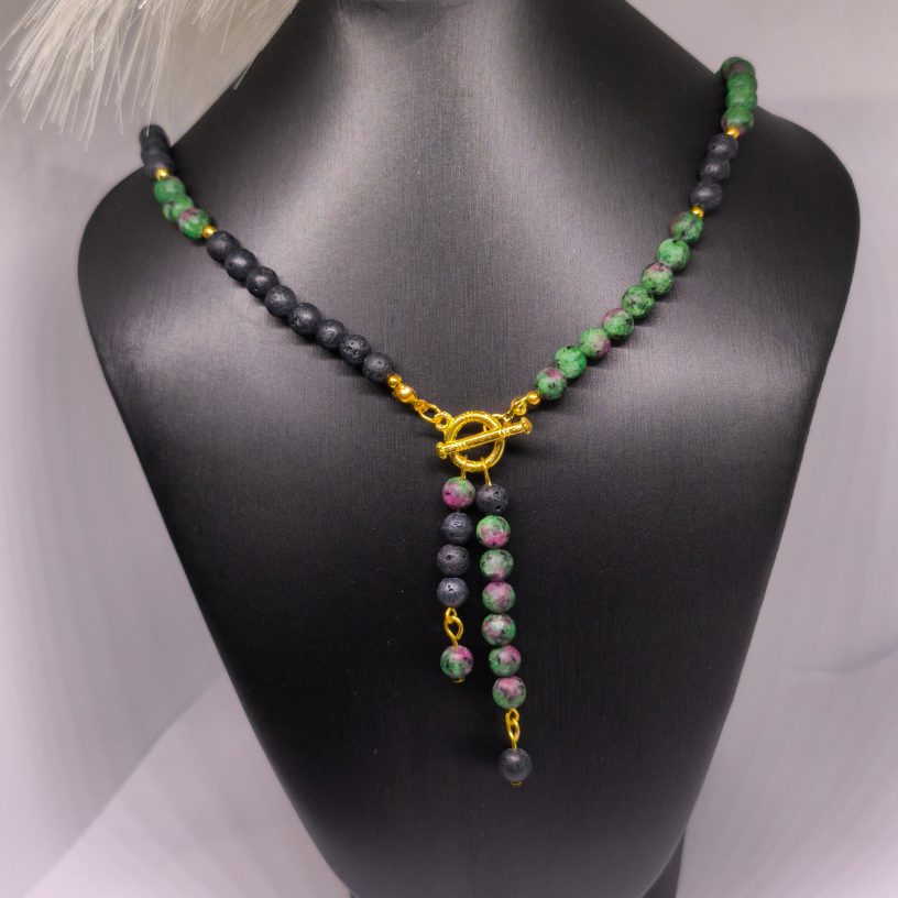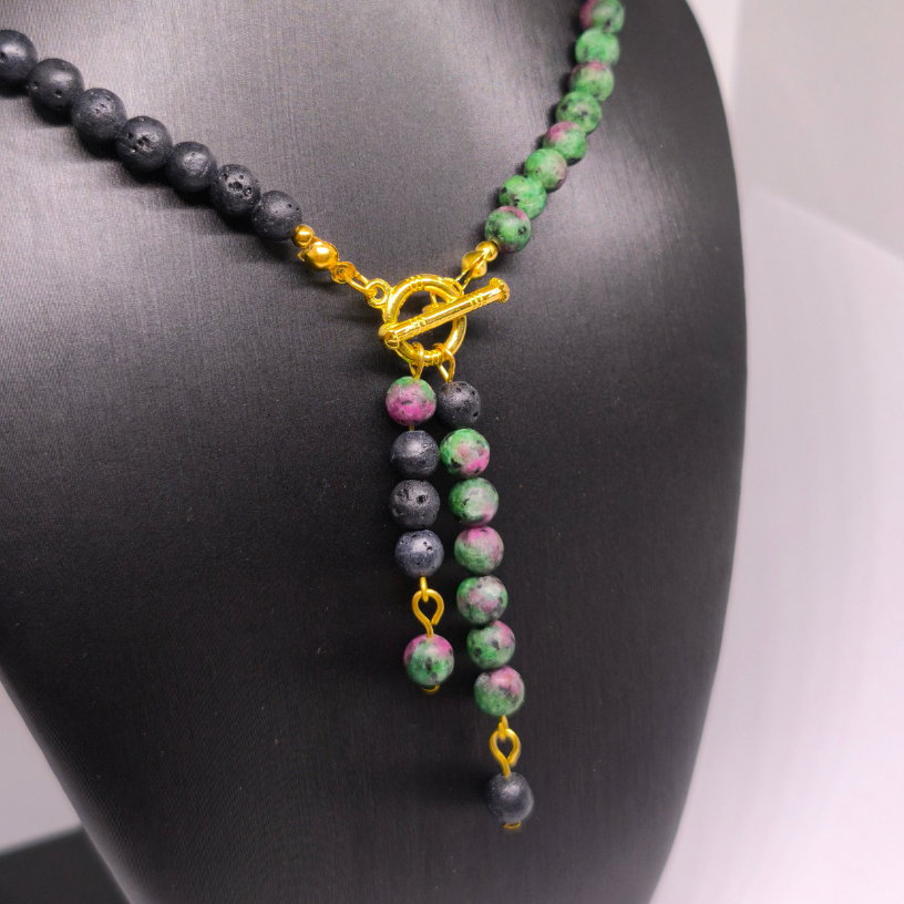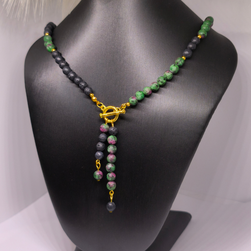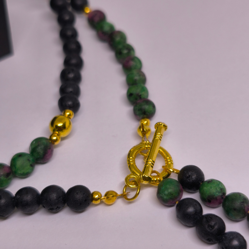 Rankų darbo vėrinys „Lavos ir rubino magija“ – išskirtinis natūralių akmenų kaklo papuošalas, sukurtas derinant juodos lavos karoliukus, zoisito su rubinu akmenis ir auksinės spalvos detales. Stilingas, ryškus ir energetiškai stiprus aksesuaras, tinkantis tiek kasdienai, tiek ypatingoms progoms.