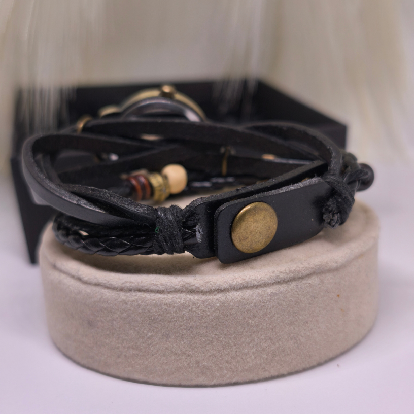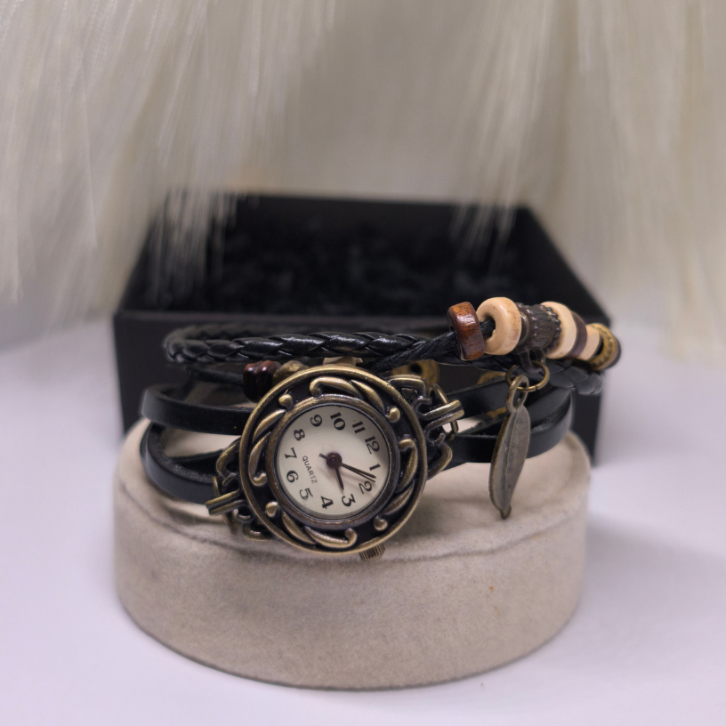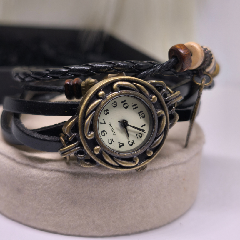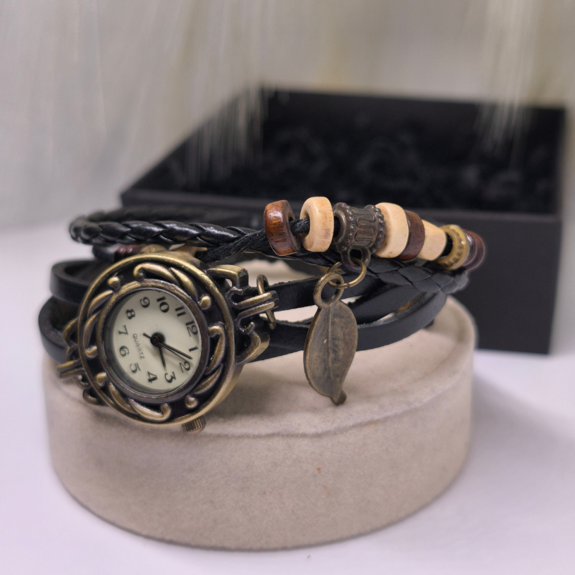 ⌚ Bronzinis laikrodžio korpusas su raižytais ornamentais primena retro laikus, o juodos odos apyrankė suteikia solidumo bei universalumo – jis tinka tiek kasdienai, tiek ypatingoms progoms. 🌿 Mediniai karoliukai ir subtilios detalės suteikia bohemiškos šilumos bei natūralumo pojūtį.