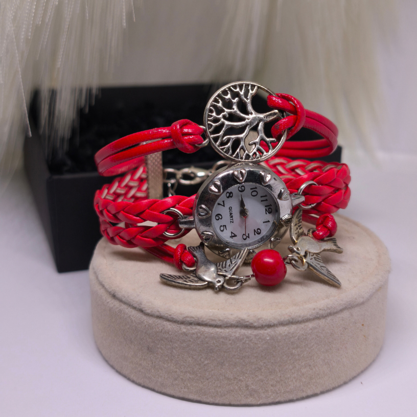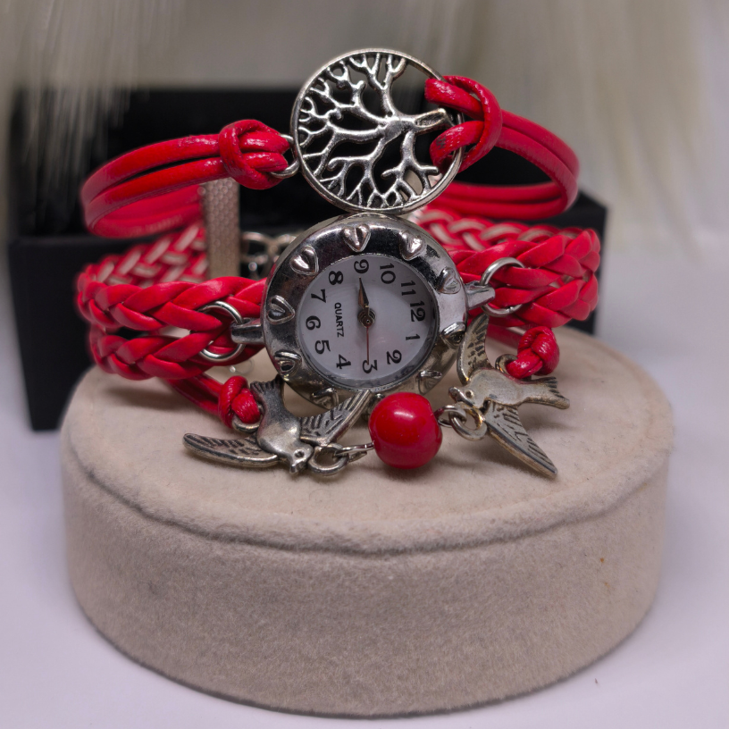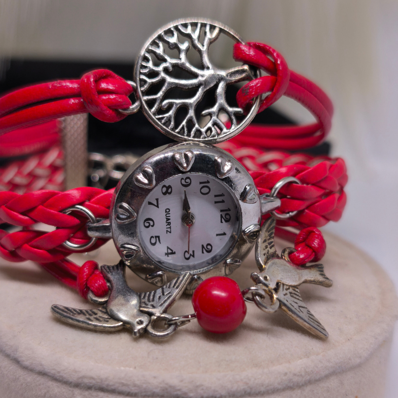 🔴 Ryškiai raudona pintinė apyrankė simbolizuoja aistrą, energiją ir pasitikėjimą savimi, o sidabriniai paukščių pakabukai – laisvės ir sielos skrydžio pojūtį. 🌿 Viršutinėje dalyje esantis Gyvybės medis primena apie stiprybę, augimą ir pusiausvyrą, o klasikinis kvarcinis laikrodis užtikrina patikslų laiko matavimą. 🕰️