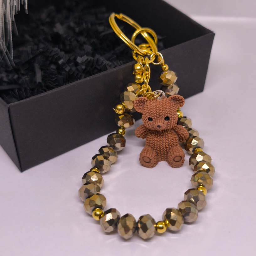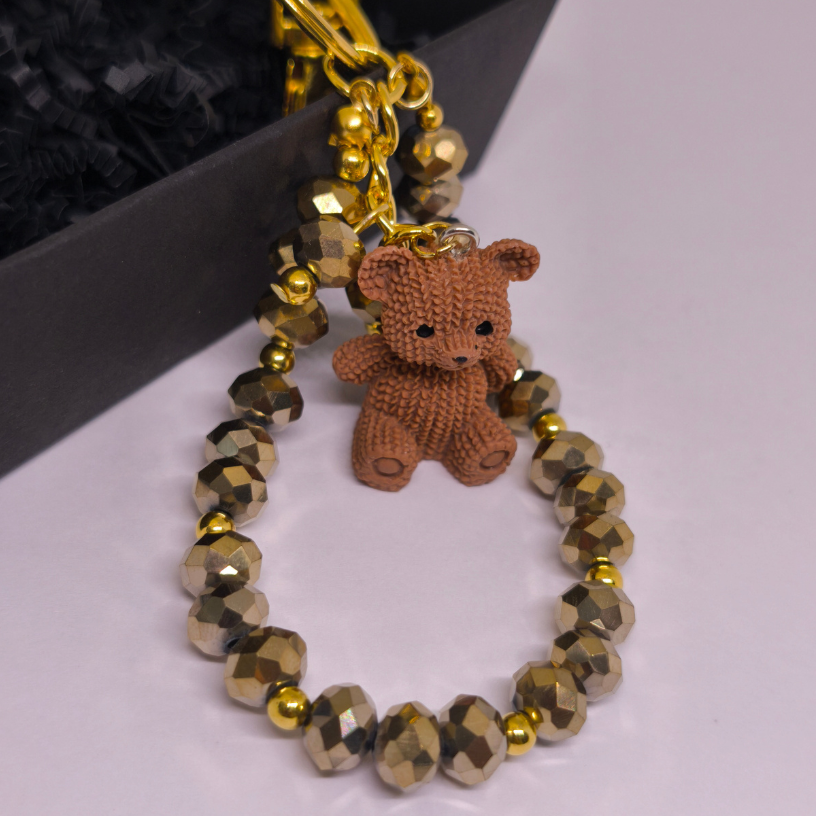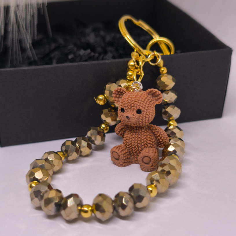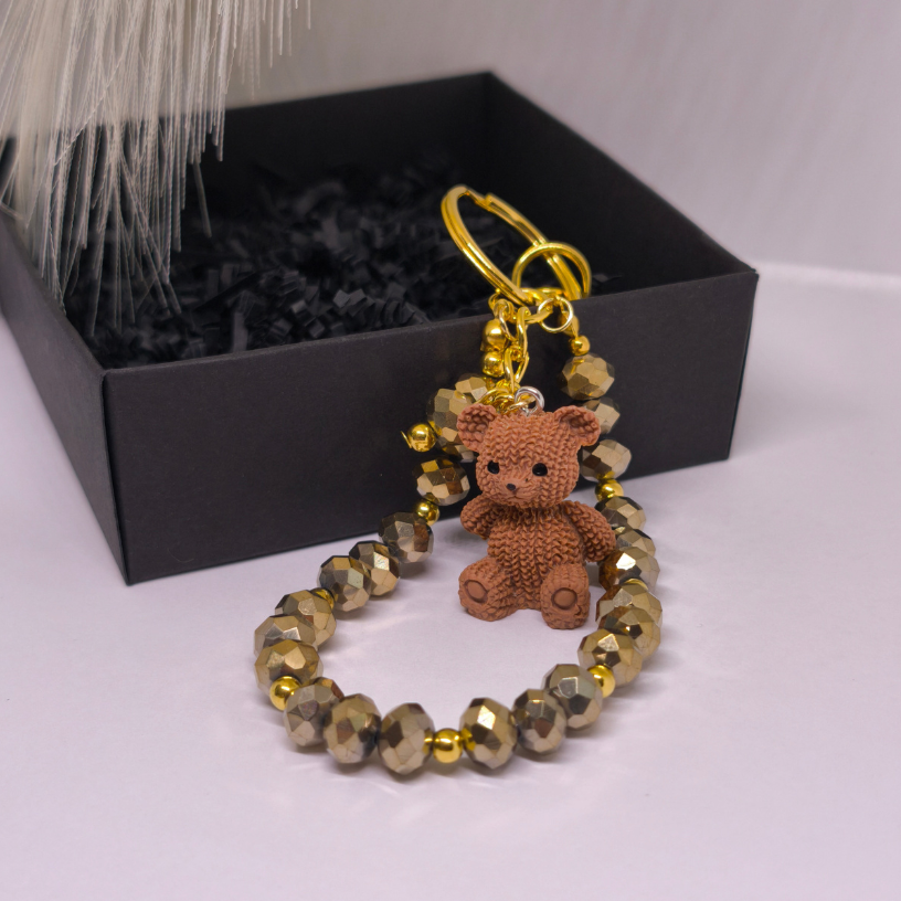 Šis rankų darbo raktų pakabukas pagamintas iš kruopščiai atrinktų stiklo kristalų, subtiliai derinamų su aukso spalvos detalėmis, kurios suteikia prabangos ir elegancijos pojūtį. Žavingas meškiukas simbolizuoja šilumą, saugumą ir pozityvią energiją. 🧸💛